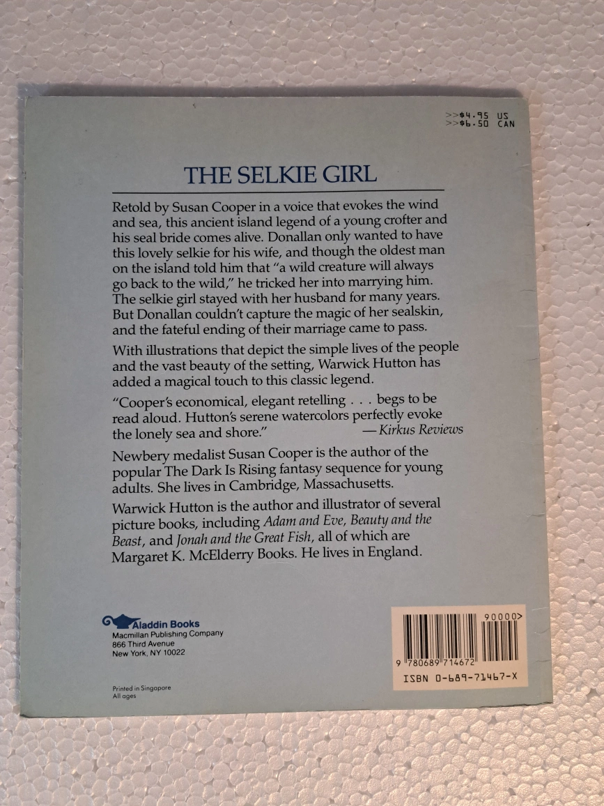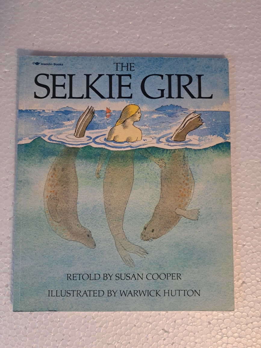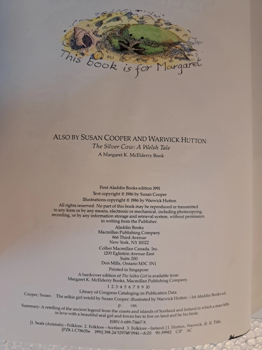 Paperback copy of Susan Cooper's retelling of the legend of the Selkie - creatures who transform between seals and beautiful women with the use of a magic sealskin. originally published 1986, this edition is from 1991 the bottom edge of the pages near the spine has been coloured with a black marker, which has bled a little onto the pages.