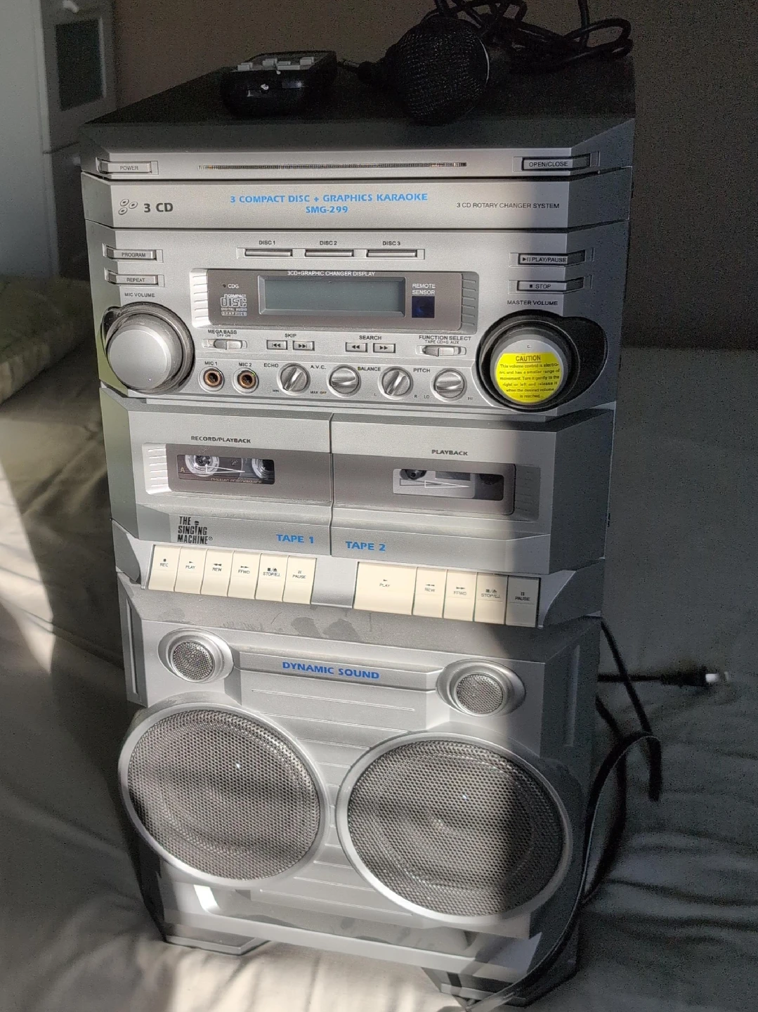 113Selling a karaoke system from The Singing Machine, model SMG-299. It's a 3 compact disc + graphics karaoke with a 3 CD rotary changer system. It also plays tapes and has dynamic sound!