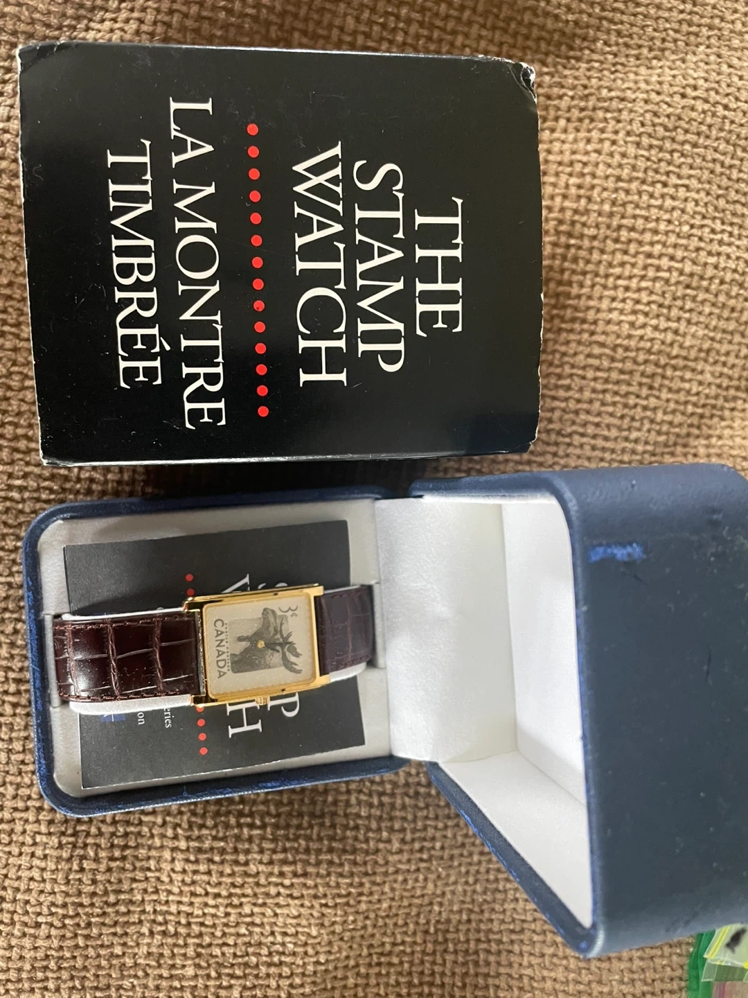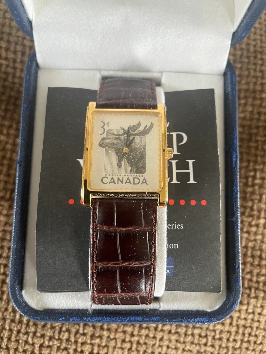 10Selling a unique Stamp Watch featuring a Canadian moose postage stamp design! It comes with its original box. The watch has a brown leather strap and a gold-tone case. A great piece for collectors or anyone who loves Canadian memorabilia