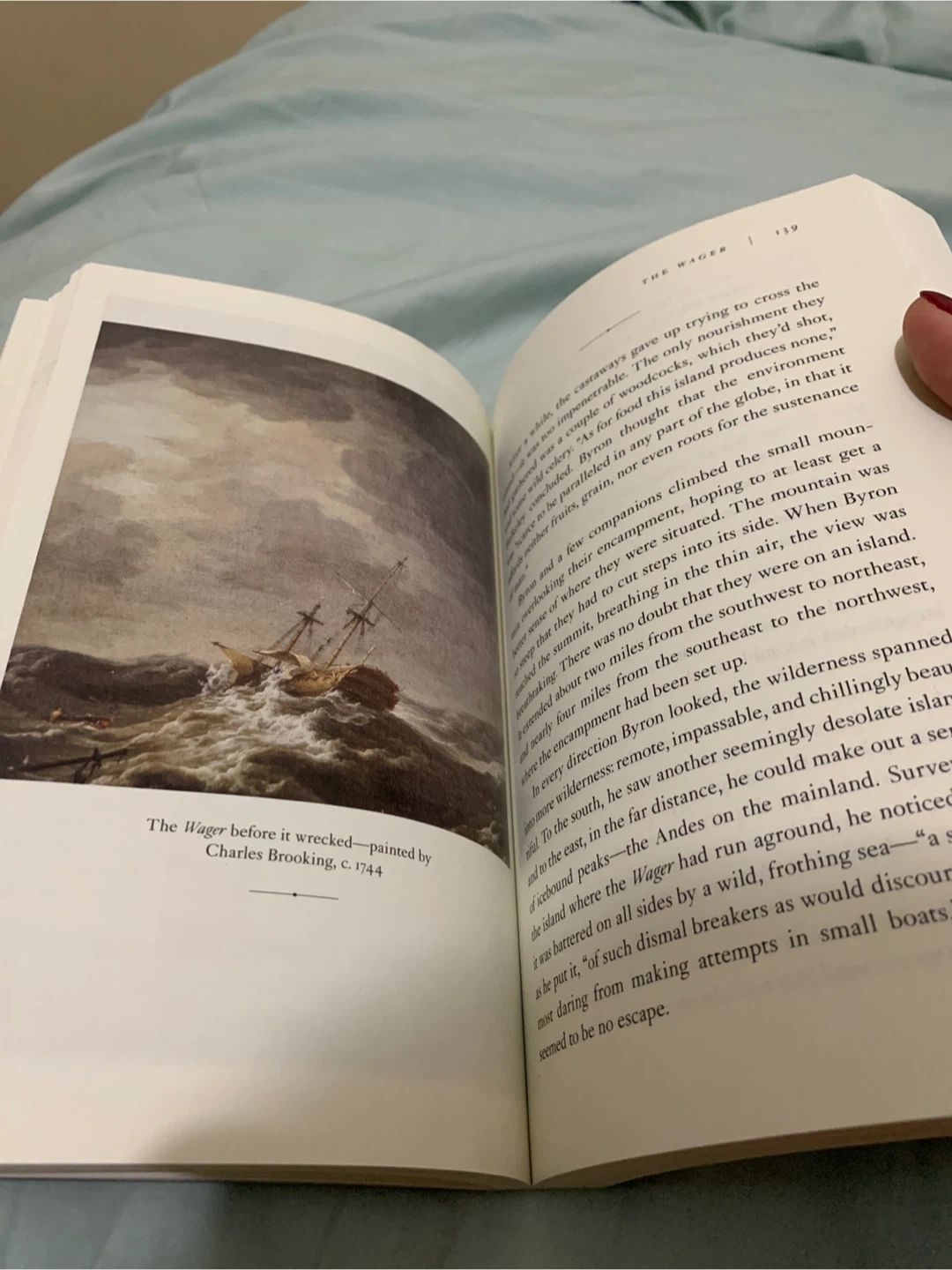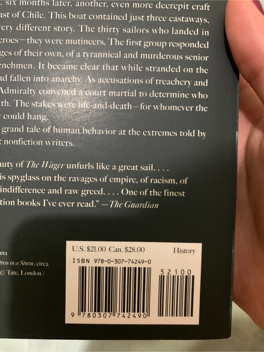 Selling a copy of "The Wager: A Tale of Shipwreck, Mutiny and Murder" by David Grann! It's a captivating read. The book falls under the history category. It originally retailed for $28.00 CAD.