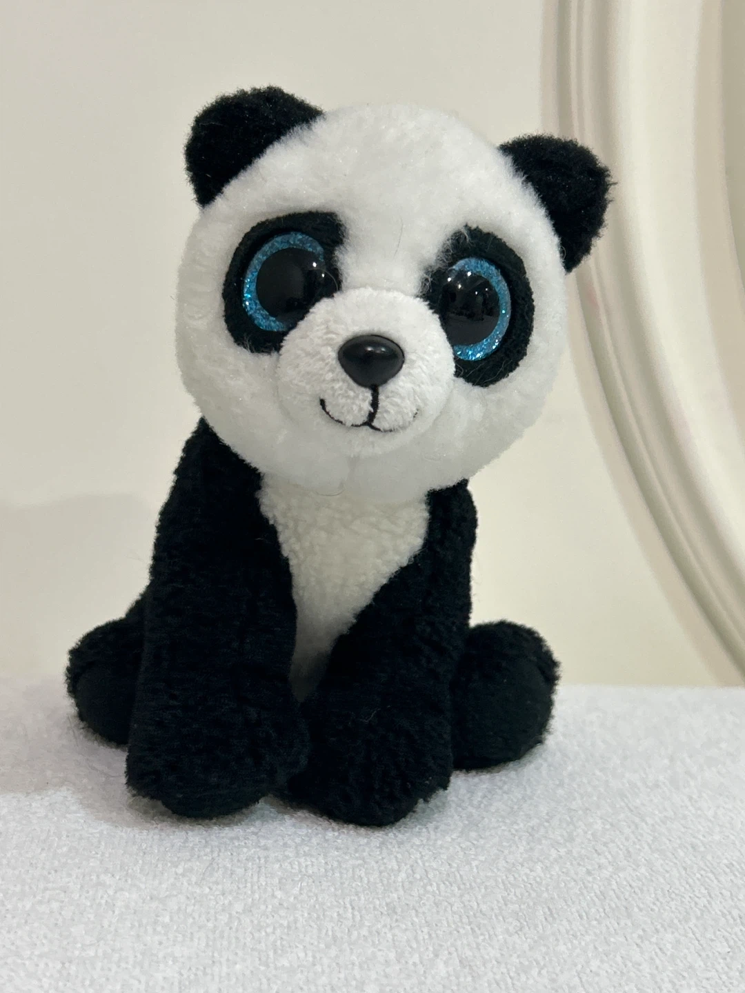 Here's a cute and cuddly Ty Beanie Boos Bamboo Panda plush toy! 6”. It features the classic black and white panda colours with sparkly blue eyes. Perfect for any Beanie Boos collector or panda lover