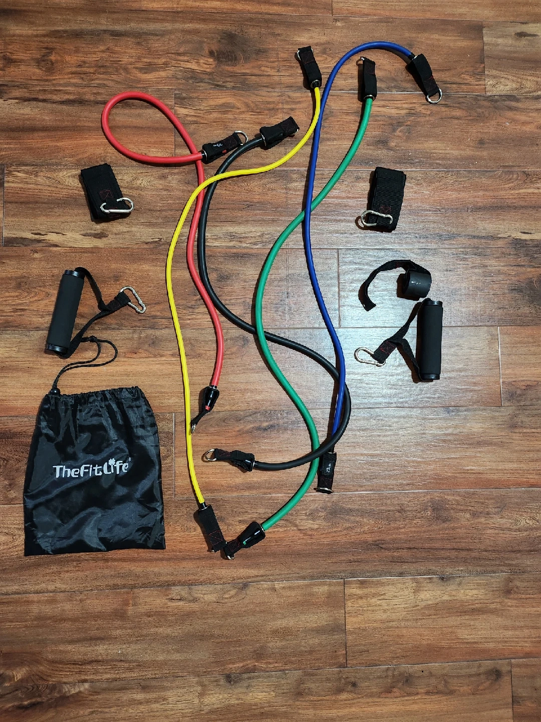60Selling a resistance band set from TheFitLife! It comes with multiple bands of varying resistance levels, plus handles and ankle straps for a full body workout. Great for at-home workouts or taking on the go
