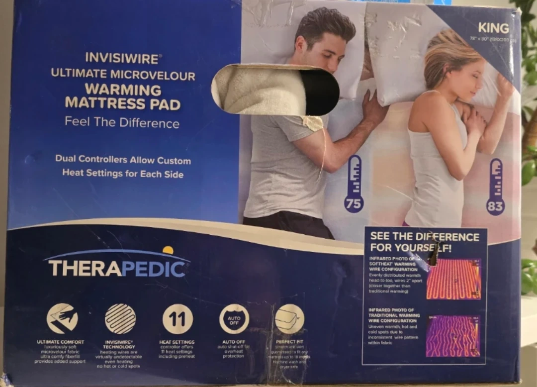 141Feel the difference with this Therapedic Invisiwire ultimate microvelour warming mattress pad! It's a king size, 78" x 80" (198x203 cm). It features dual controllers that allow custom heat settings for each side. The mattress pad has 11 heat settings including preheat and auto-off for overheat protection. It's designed and engineered in the USA and has a 5-year warranty. BRAND NEW IN BOX