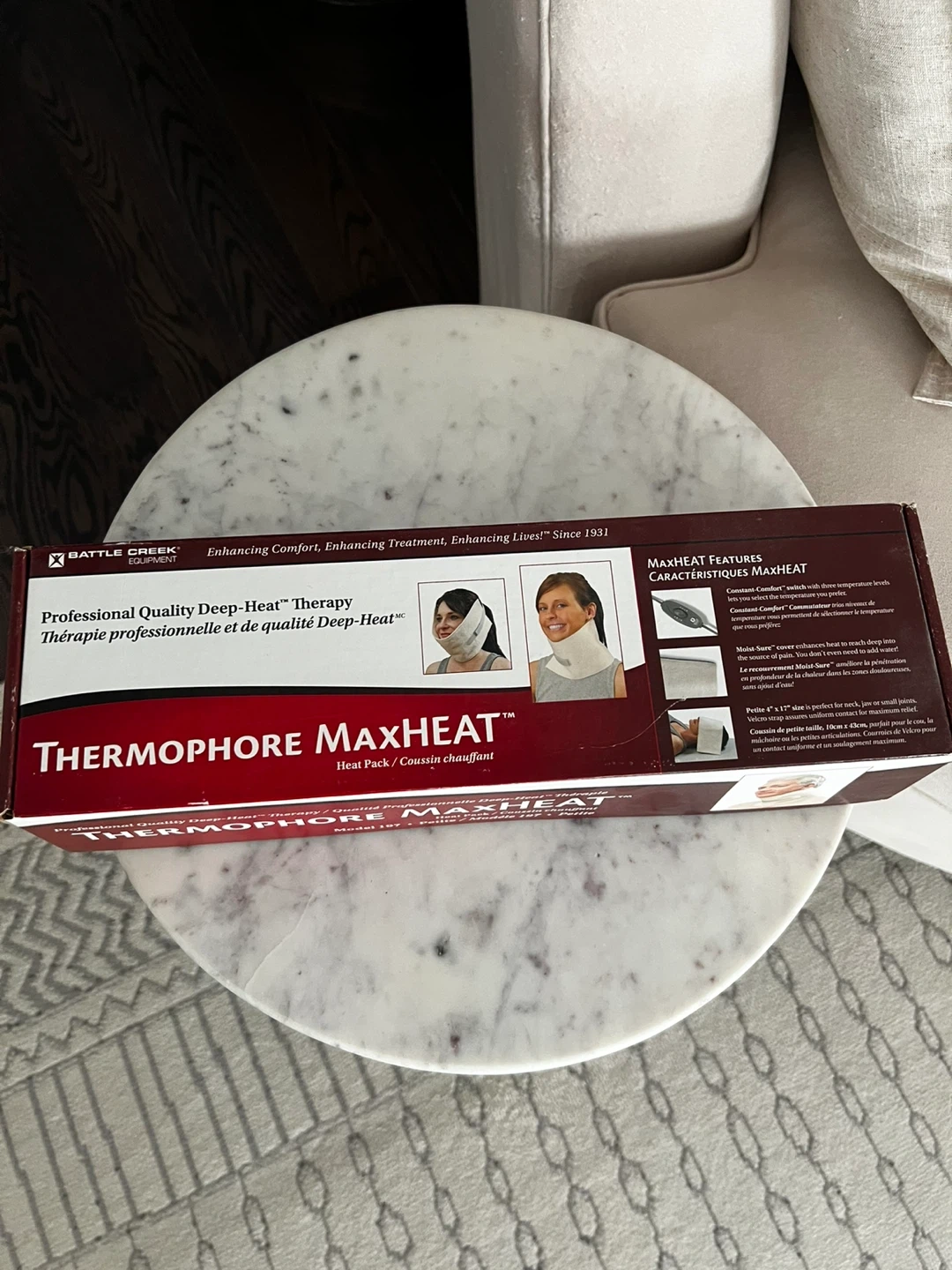 23I'm selling a brand new Thermophore MaxHeat heat pack, still in its original box! This provides professional quality deep-heat therapy to enhance comfort and treatment. - Constant-Comfort switch with three temperature levels - Moist-Sure cover enhances heat to reach deep into the source of pain - Petite 4" x 17" size is perfect for neck, jaw or small joints - Velcro strap assures uniform contact for maximum relief