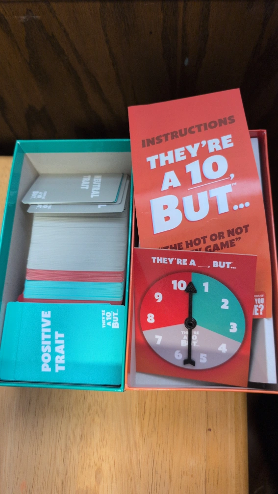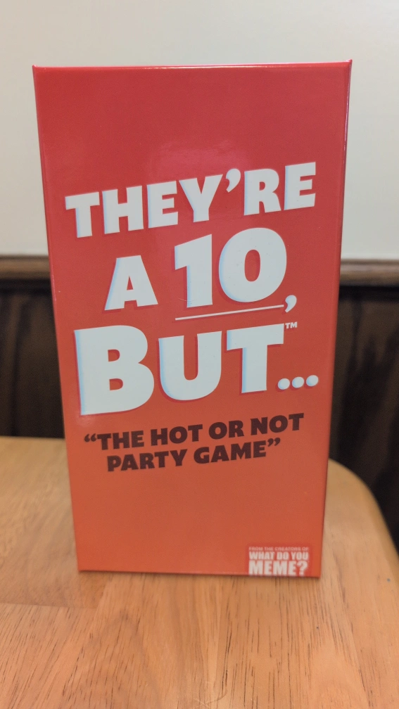 15Selling the 'They're a 10, But...' party game by What Do You Meme? This is the 'Hot or Not' game that's a great conversation starter. Includes: - Spinner - 300 Trait Cards - Instructions Get ready for some fun debates with friends!
