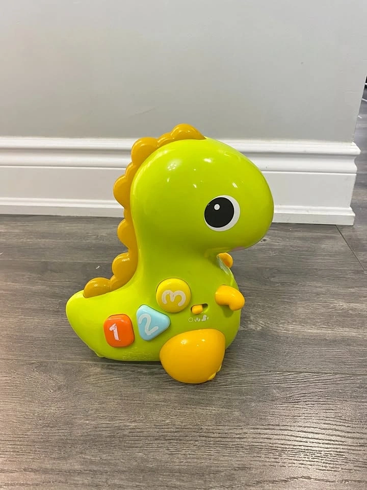 The Go, Go Dino musical light-up dinosaur toy from Bright Starts rolls around to encourage baby to get moving. When you've caught up to this dinosaur toy, discover numbers, colors and shapes with easy to push buttons. Just a tap of the nose will activate music, lights, motion and silly sounds. Get ready to T-Rex & ROLL!