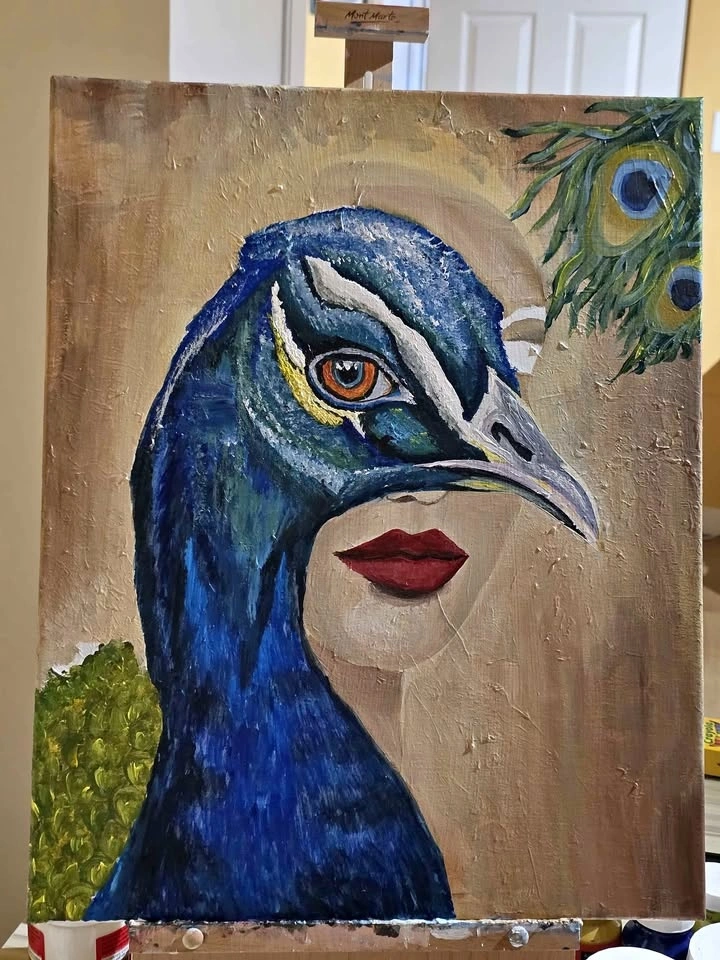 PEACOCK AND WOMAN ACRYLIC PAINTING