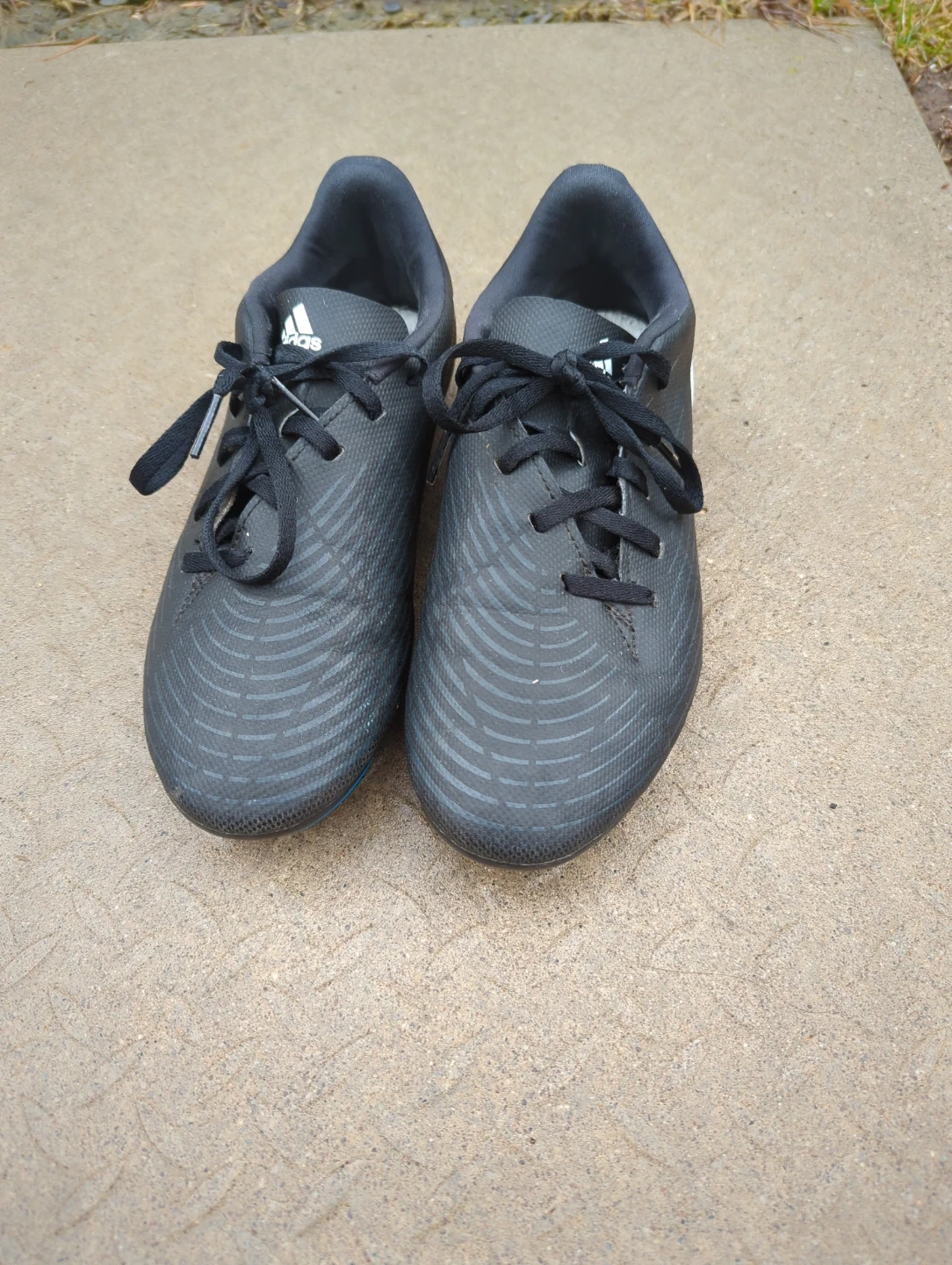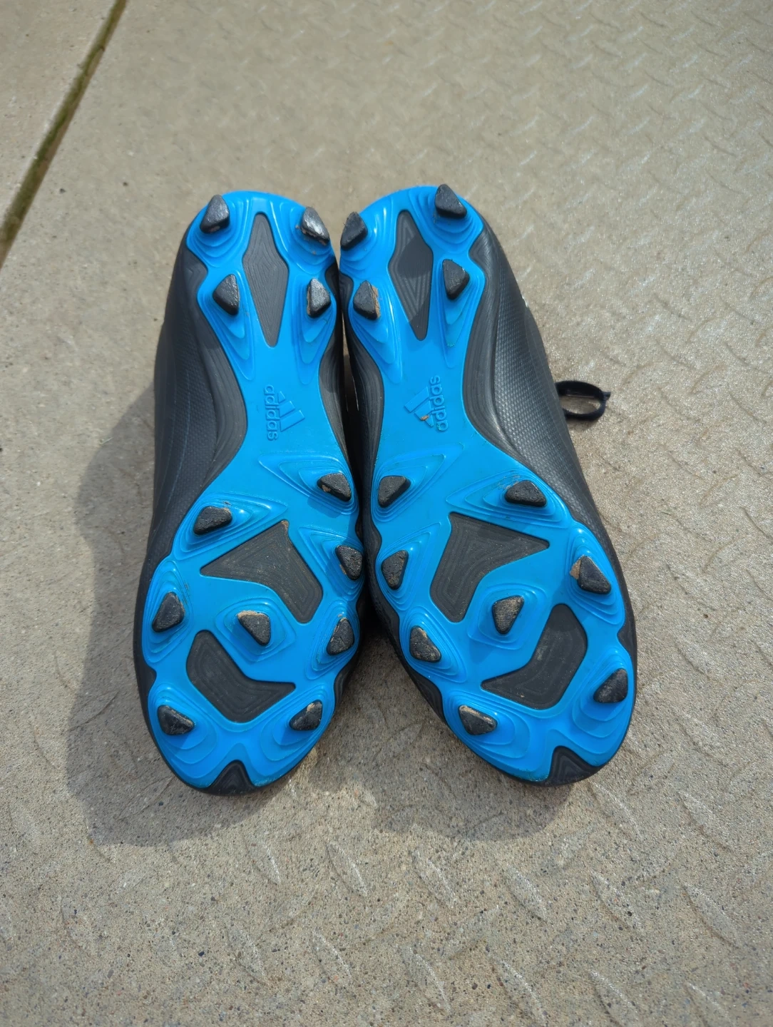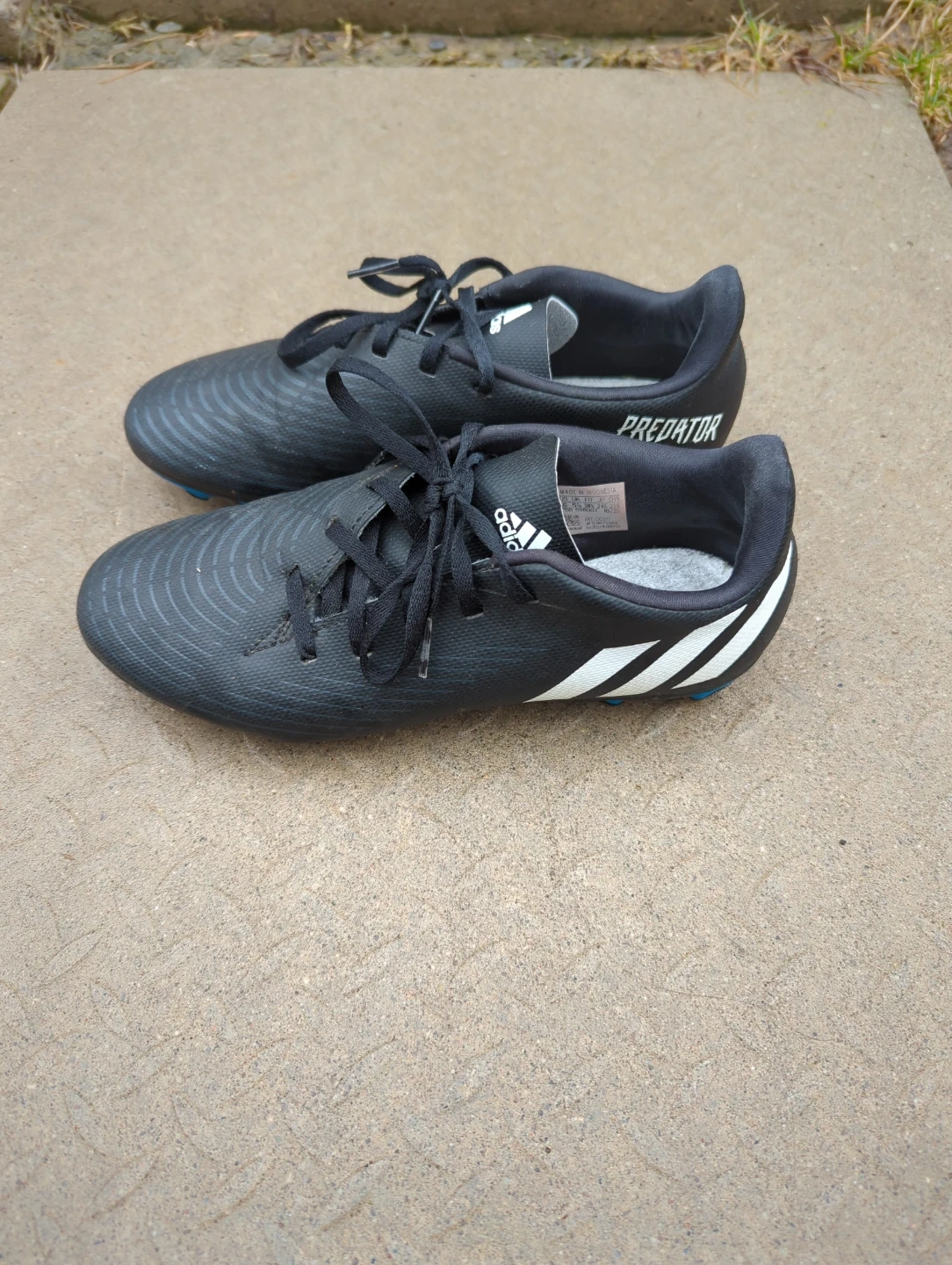 Black Adidas Predator cleats with white accents. These soccer cleats feature a durable synthetic upper and a vibrant blue sole with moulded studs for traction. Ready for the pitch!