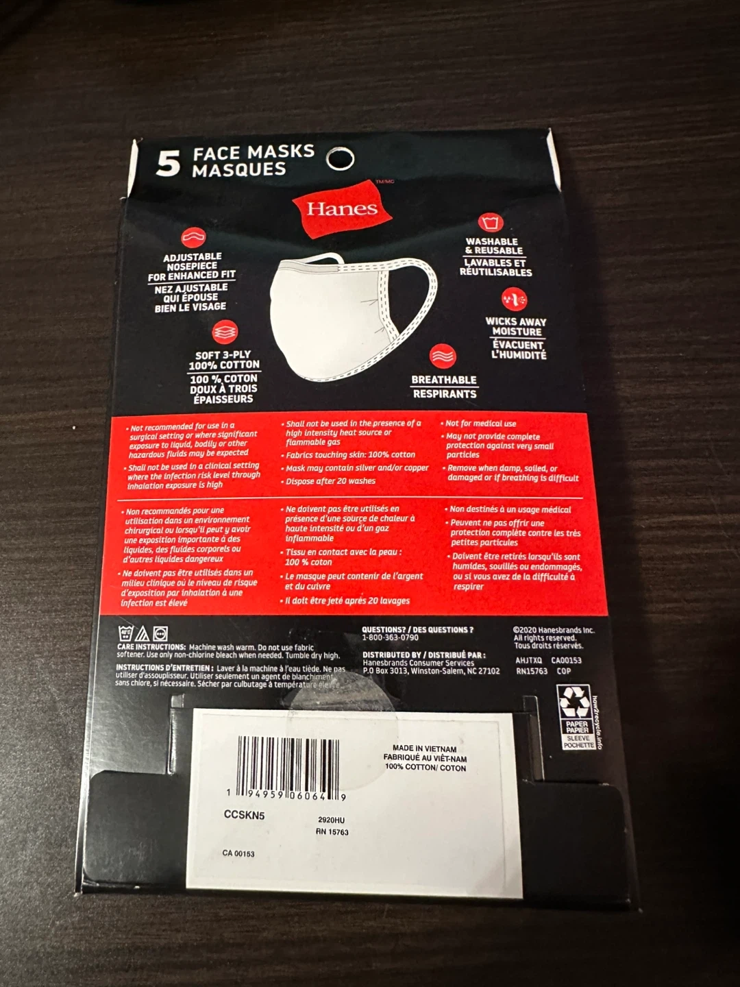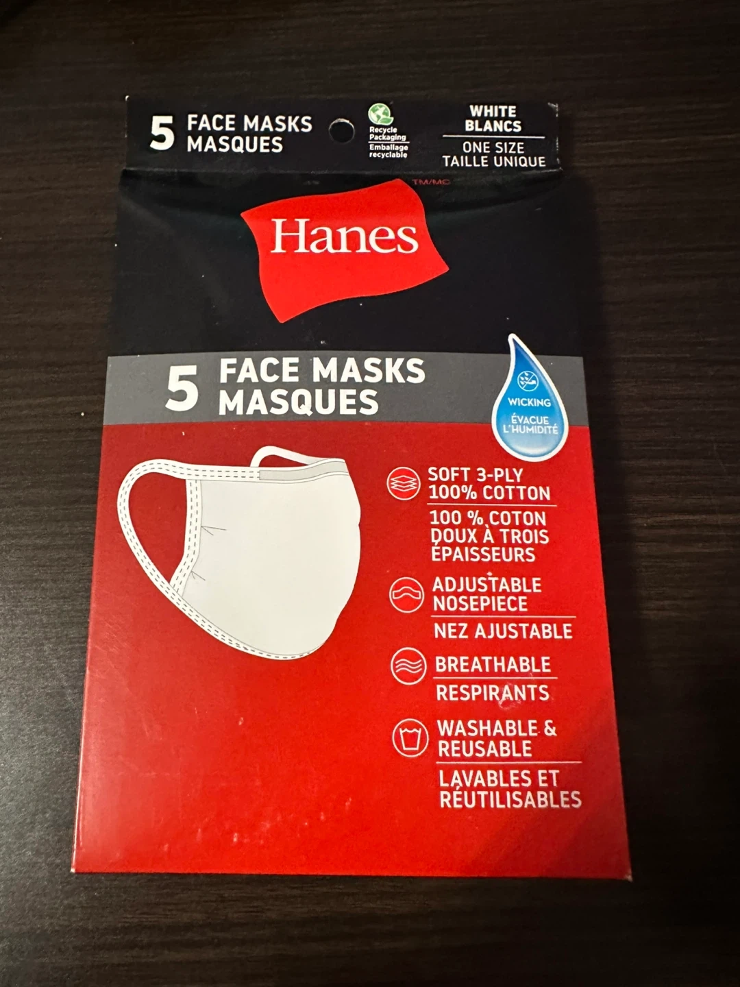 I'm selling a pack of 5 Hanes face masks in white, one size fits all. They're soft, 3-ply, and made of 100% cotton. These masks feature an adjustable nose piece and are breathable, washable, and reusable. They also wick away moisture for added comfort!