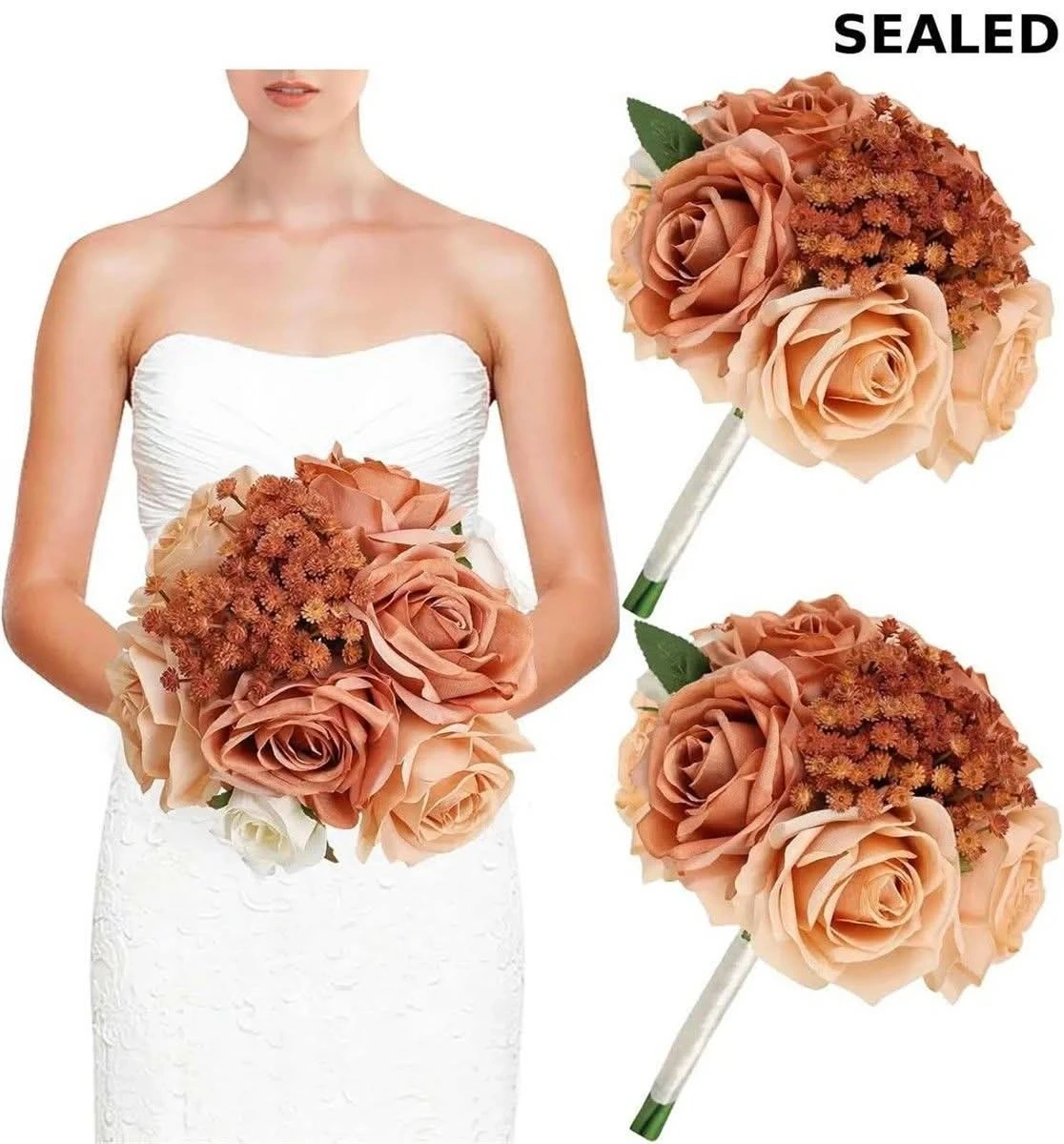 This set includes two artificial silk rose bouquets, perfect for weddings or events. They're designed with realistic roses in warm, earthy tones. Floral arrangements for celebrations!