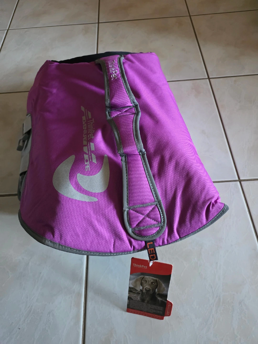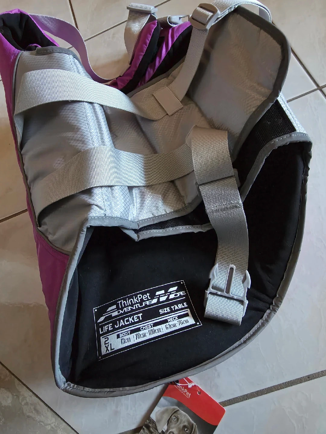 75This is a ThinkPet Adventure Life Jacket for dogs. It's in excellent condition and size 2XL. The jacket is purple and features a comfortable and secure fit for your furry friend. Perfect for water activities and ensuring your dog's safety!