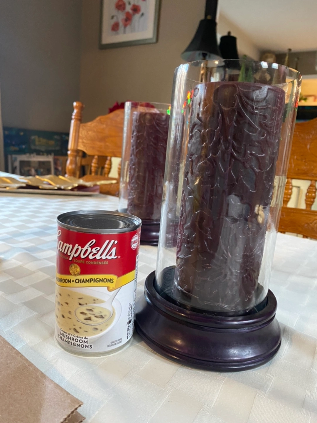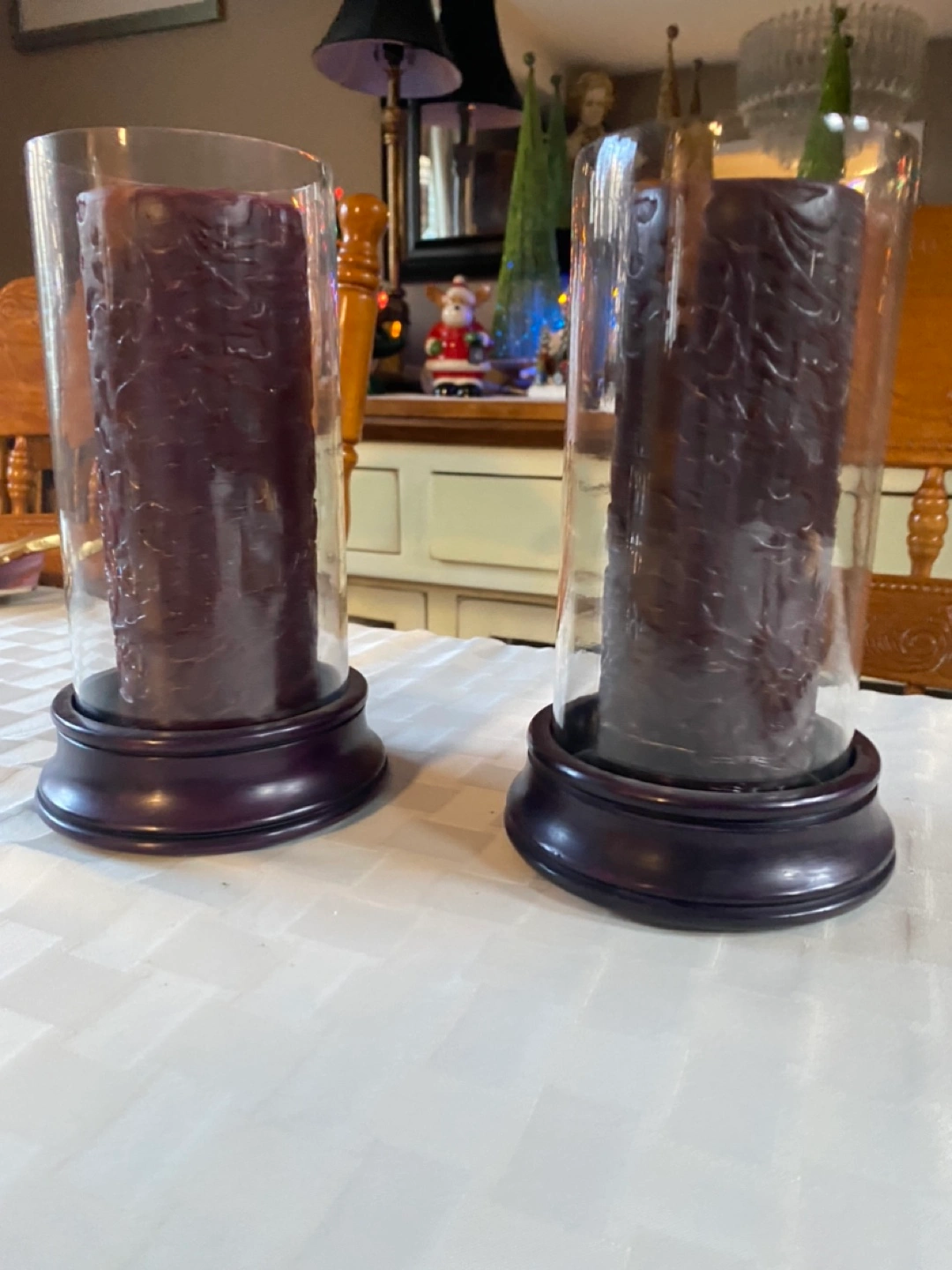 Yankee Candle—-Two glass candle holders with wooden bases. The candle holders are approximately 8 inches tall. Selling together $30.00 PUCK UP PICKERING WHITES RD & STROUDS LANE