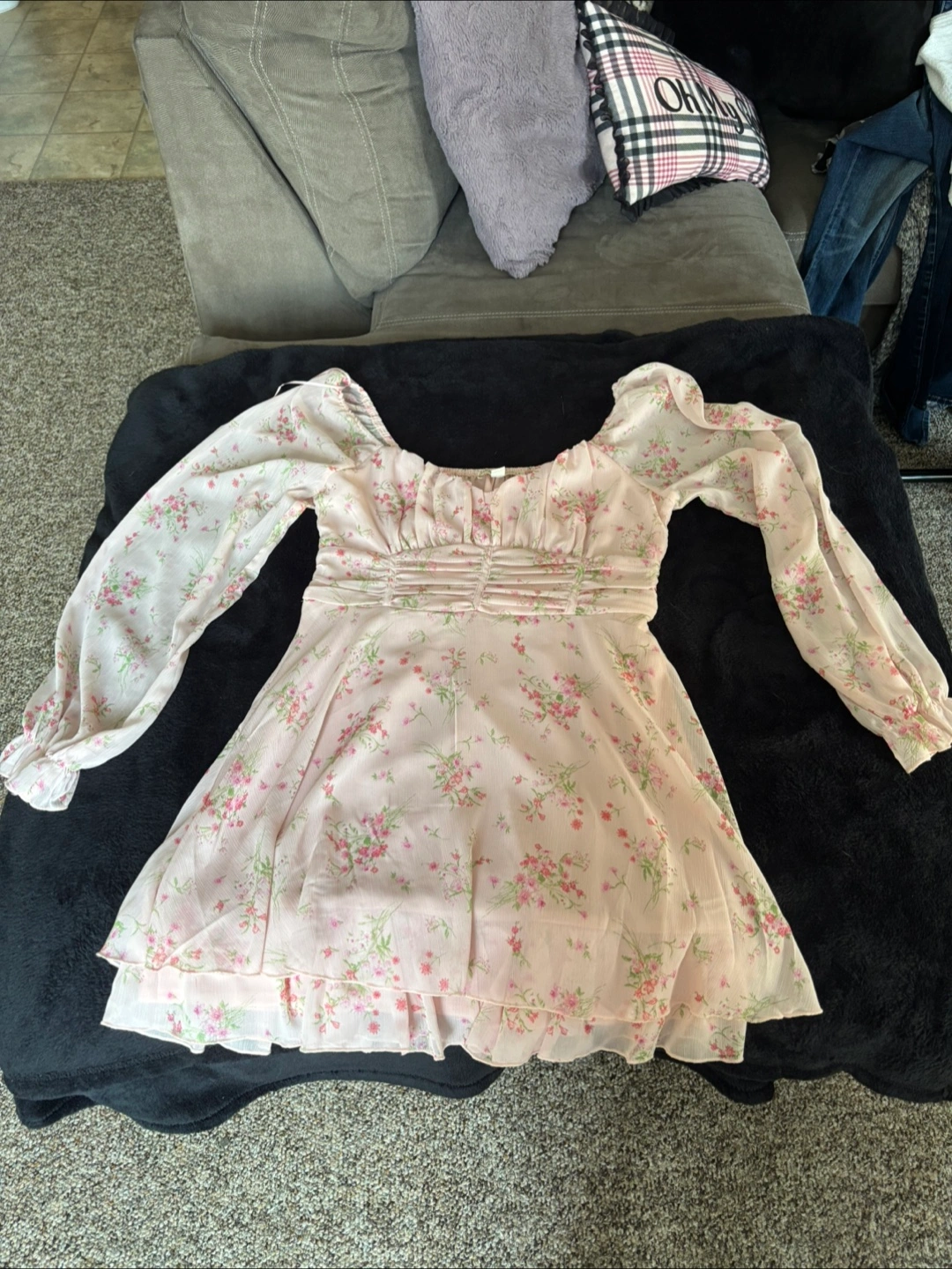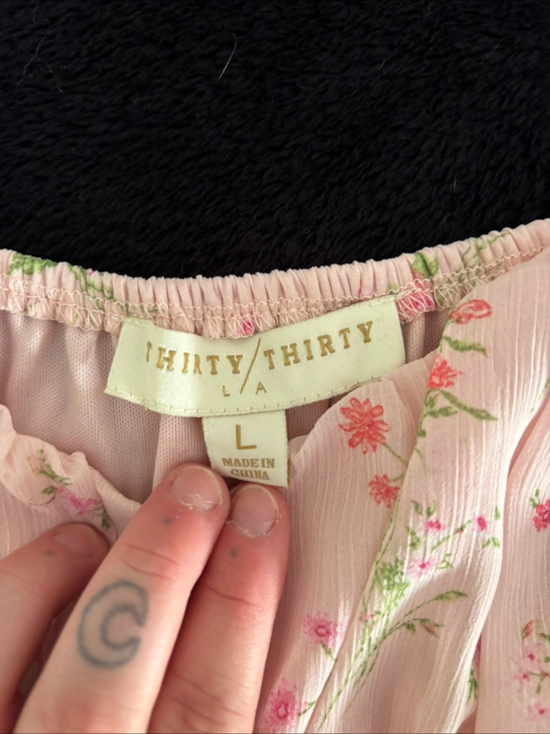 Selling a cute floral dress from Thirty/Thirty! It's a size large and has a lovely light pink floral pattern. Perfect for a summer day or a special occasion