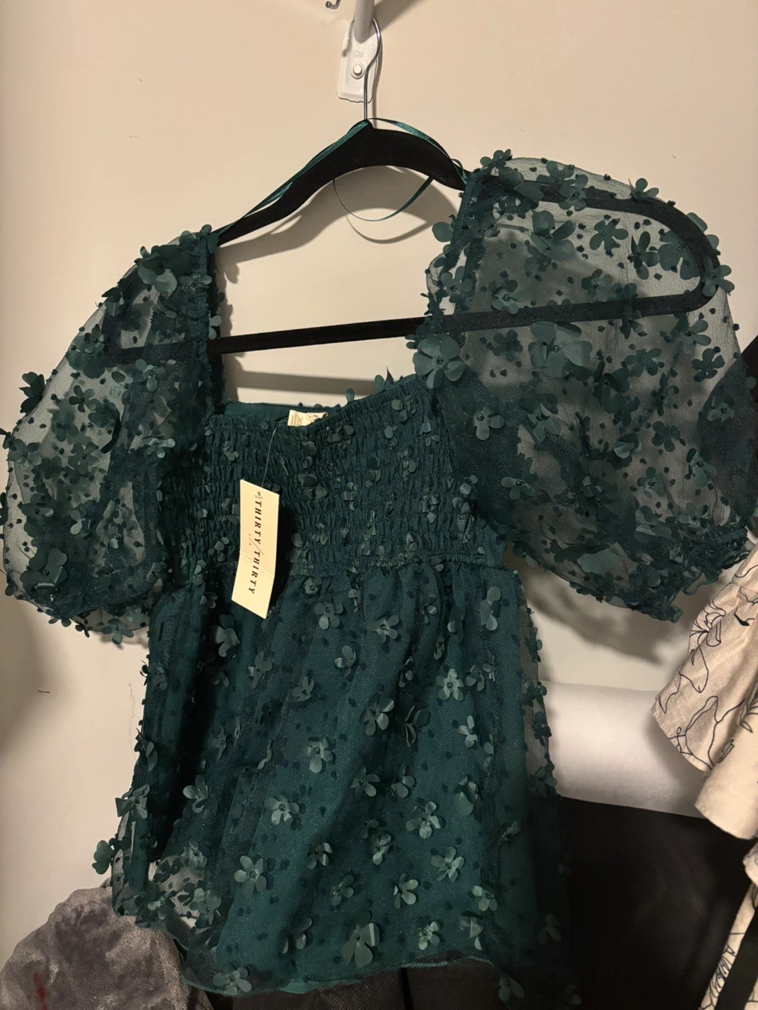 This is a lovely green top from Thirty Thirty! It features a square neckline and sheer sleeves with floral detailing. Perfect for dressing up or down! It is brand new and never worn.