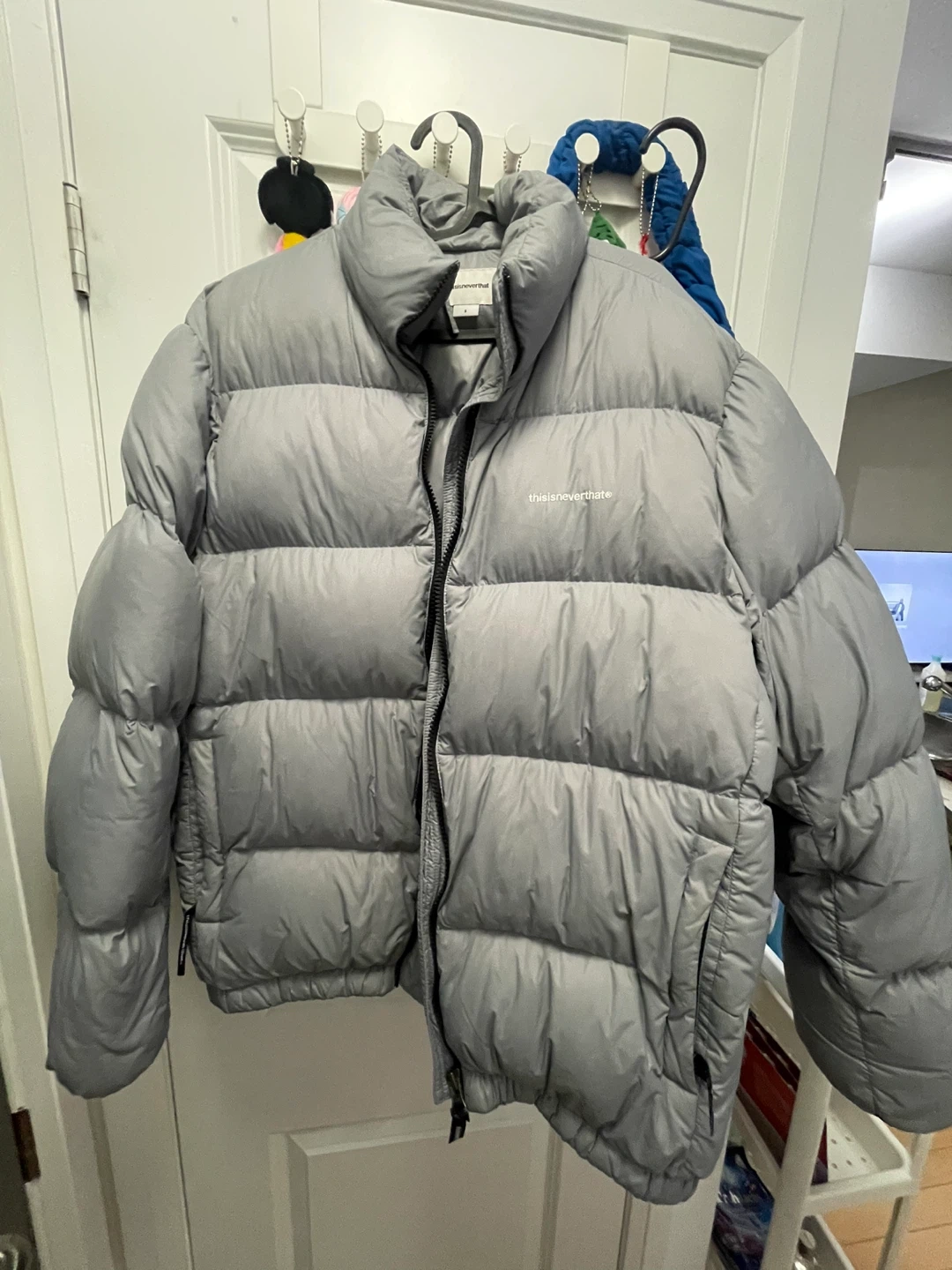 Selling a small thisisneverthat puffer in grey. It's in great condition and ready for a new home. Perfect for staying warm and stylish!