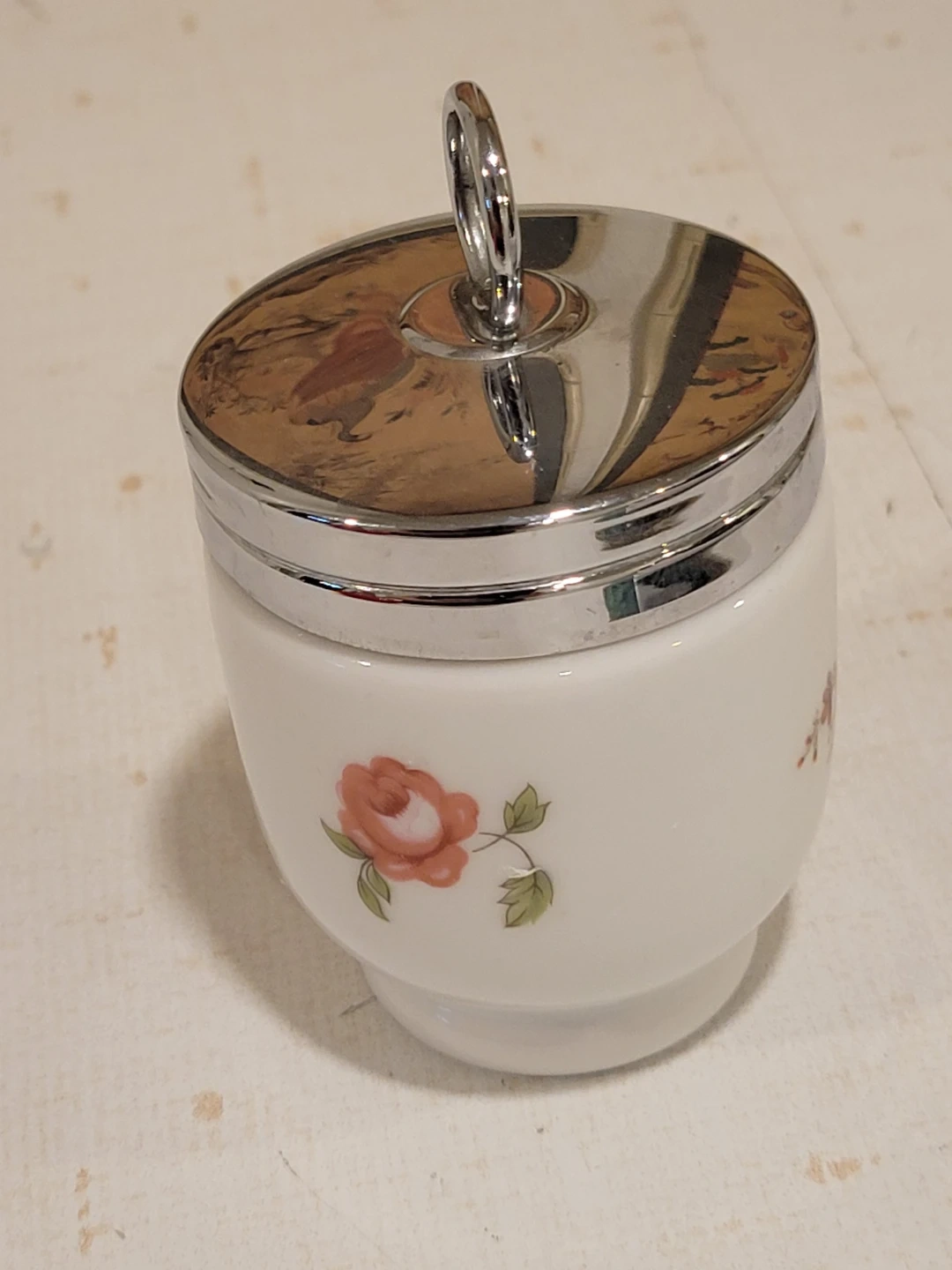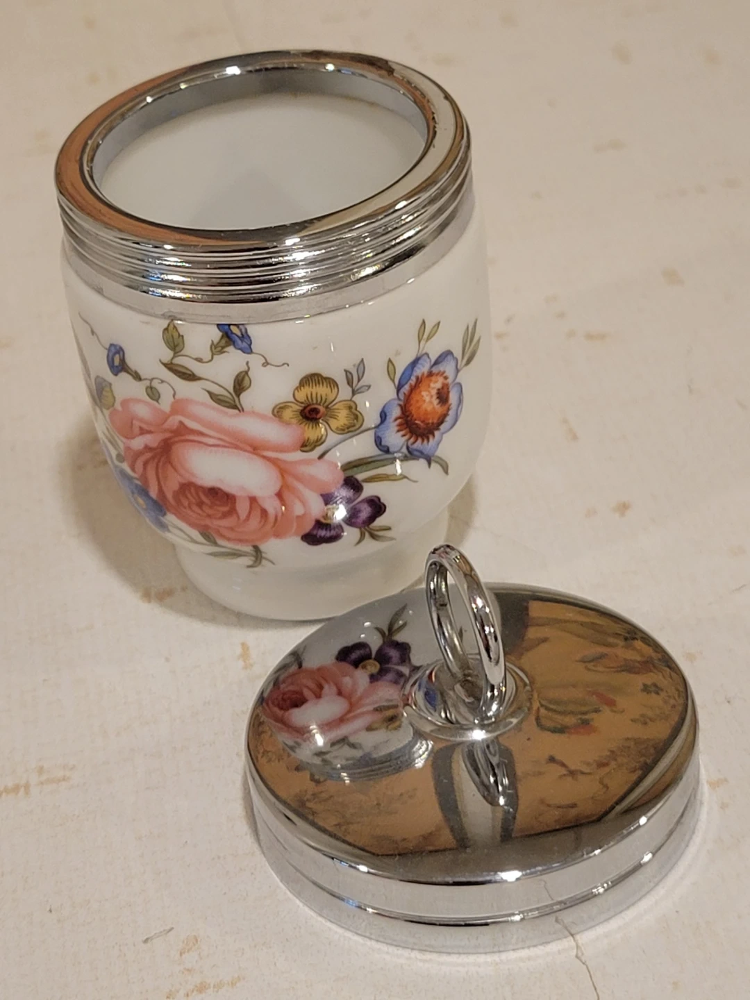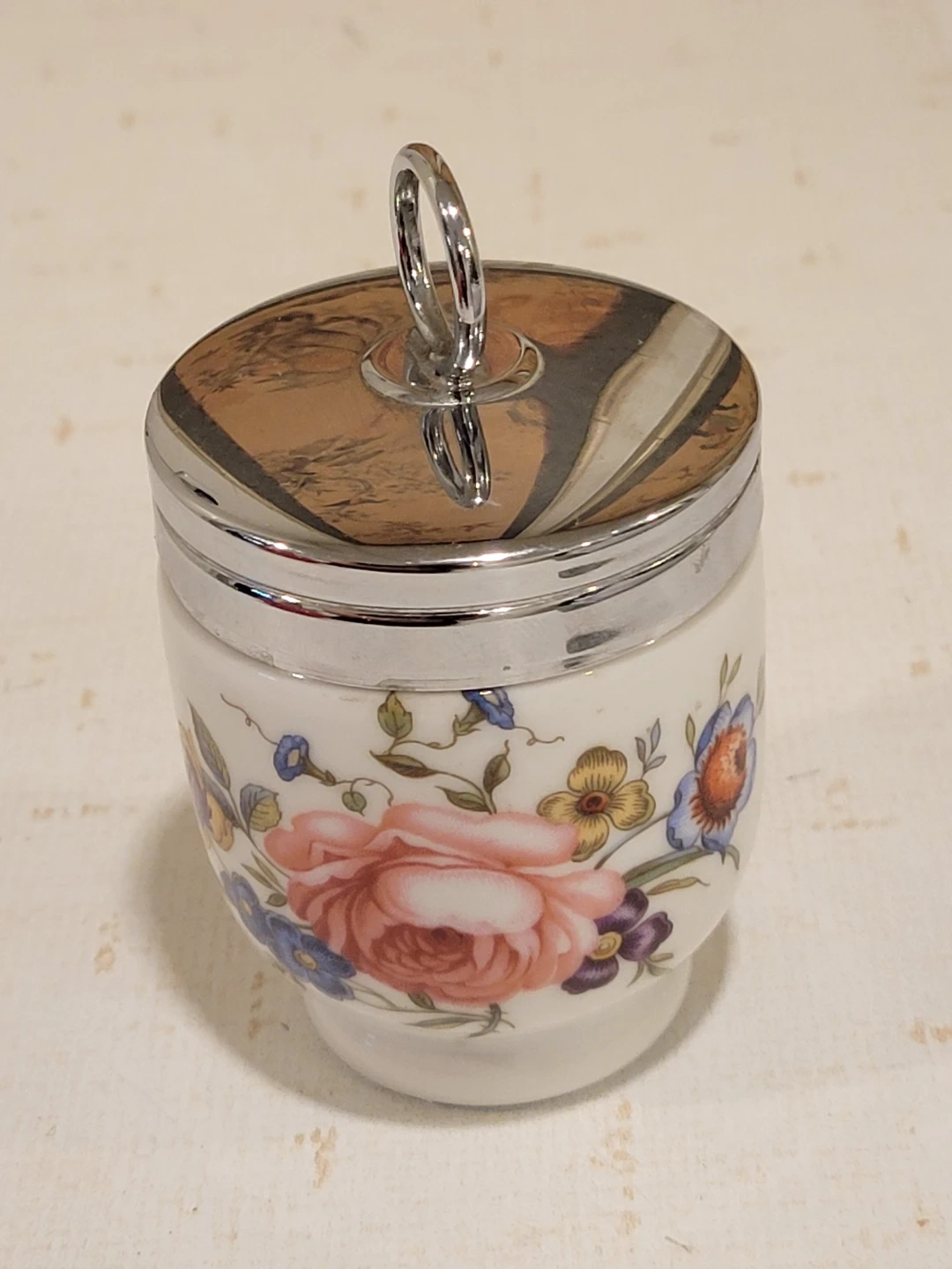 This charming vintage Royal Worcester porcelain egg coddler, made in England, features a delightful floral design and a convenient chrome top with a loop. It's a lovely piece for adding a touch of elegance to your breakfast routine! The Royal Worcester egg coddler is known for being high-quality pieces.