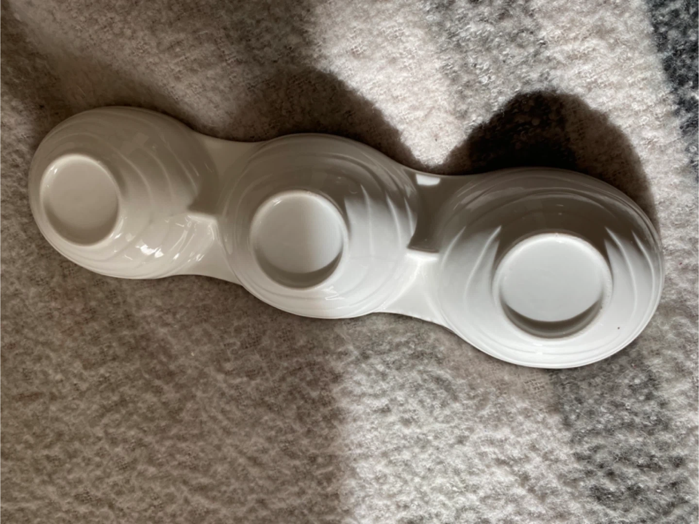 White ceramic serving dish with three connected sections. Measures approximately 12 inches long. Dishwasher safe.