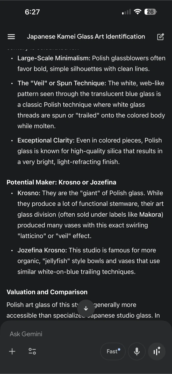 Beautiful vase featuring a swirling pattern of blue and grey glass. This piece showcases the unique 'veil' or 'spun' technique, where white glass threads are spun onto the colored body while molten. It's a striking decorative item that catches the light nicely.