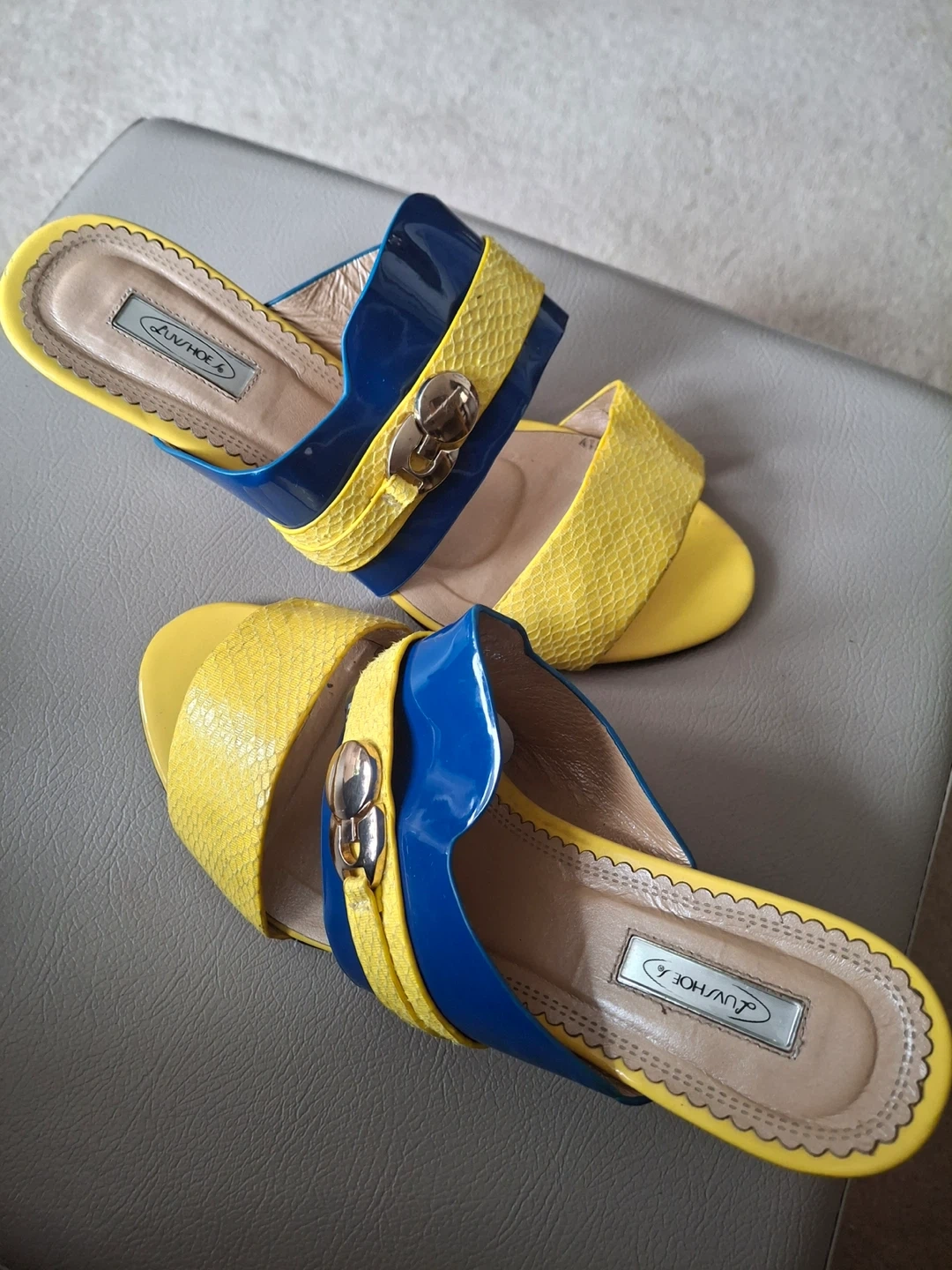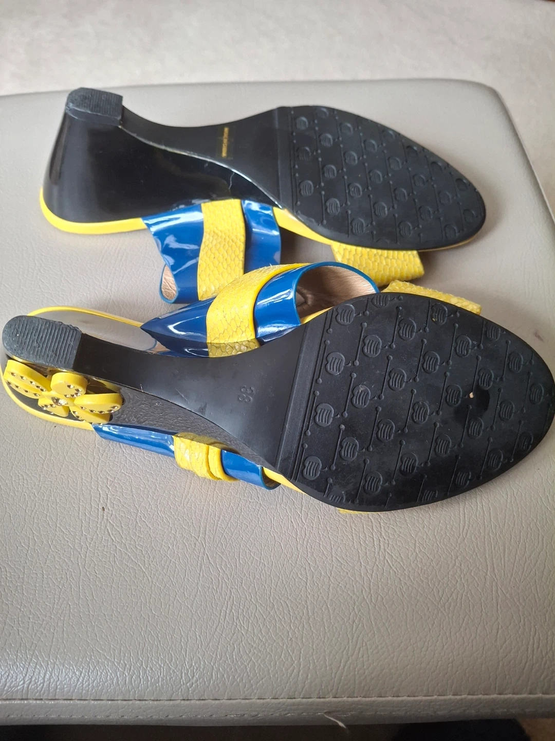 Yellow and dark blue shoes with brass-like detail and a fun flower detail on the heel. 3” heel. Size 8, Eur 38. Luvshoes brand. Worn only twice (slight scuff at bottom of one heel)