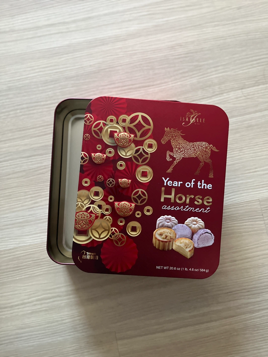 Selling an Isabelle Year of the Horse assortment tin. It's in great condition and ready for a new purpose! The tin is decorated with a festive design featuring a horse and traditional Chinese elements. Perfect for storing small items or using as a decorative piece