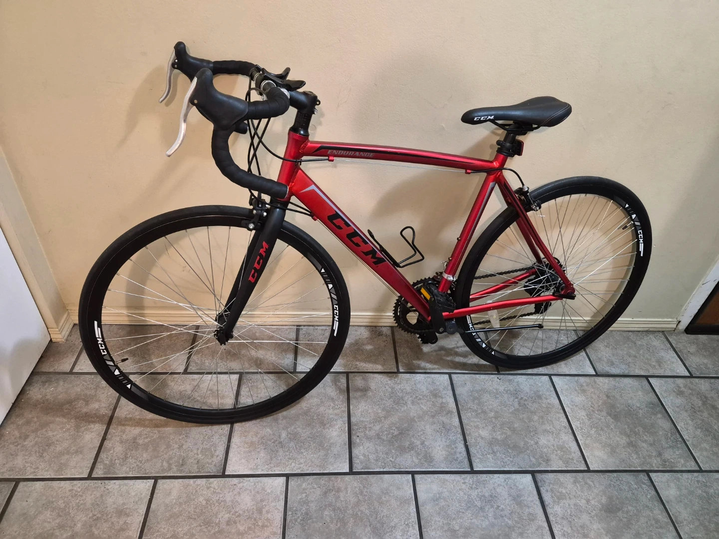 This CCM road bike is a great choice for cycling. It features a lightweight frame and is perfect for getting around town or going for a ride. The bike is red and comes with a water bottle cage.
