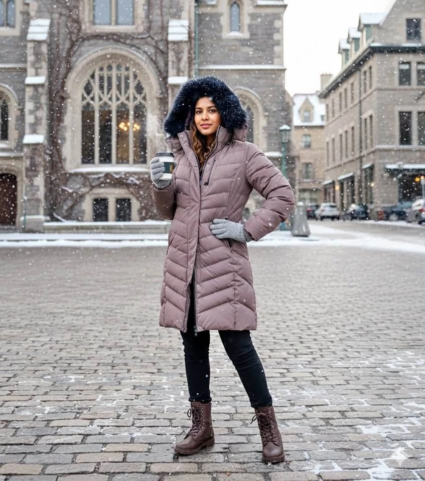 Beat the freeze with this beautiful, high-performance winter coat! This jacket combines a flattering, slim-fit silhouette with heavy-duty warmth, making it perfect for those freezing commute days or snowy weekend walks. Warm long quilted winter jacket. Has a cozy faux fur hood. Mauve color, perfect for staying comfy and stylish in the cold.