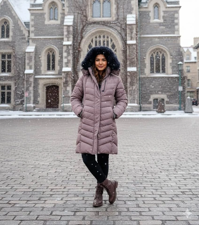 Beat the freeze with this beautiful, high-performance winter coat! This jacket combines a flattering, slim-fit silhouette with heavy-duty warmth, making it perfect for those freezing commute days or snowy weekend walks. Warm long quilted winter jacket. Has a cozy faux fur hood. Mauve color, perfect for staying comfy and stylish in the cold.