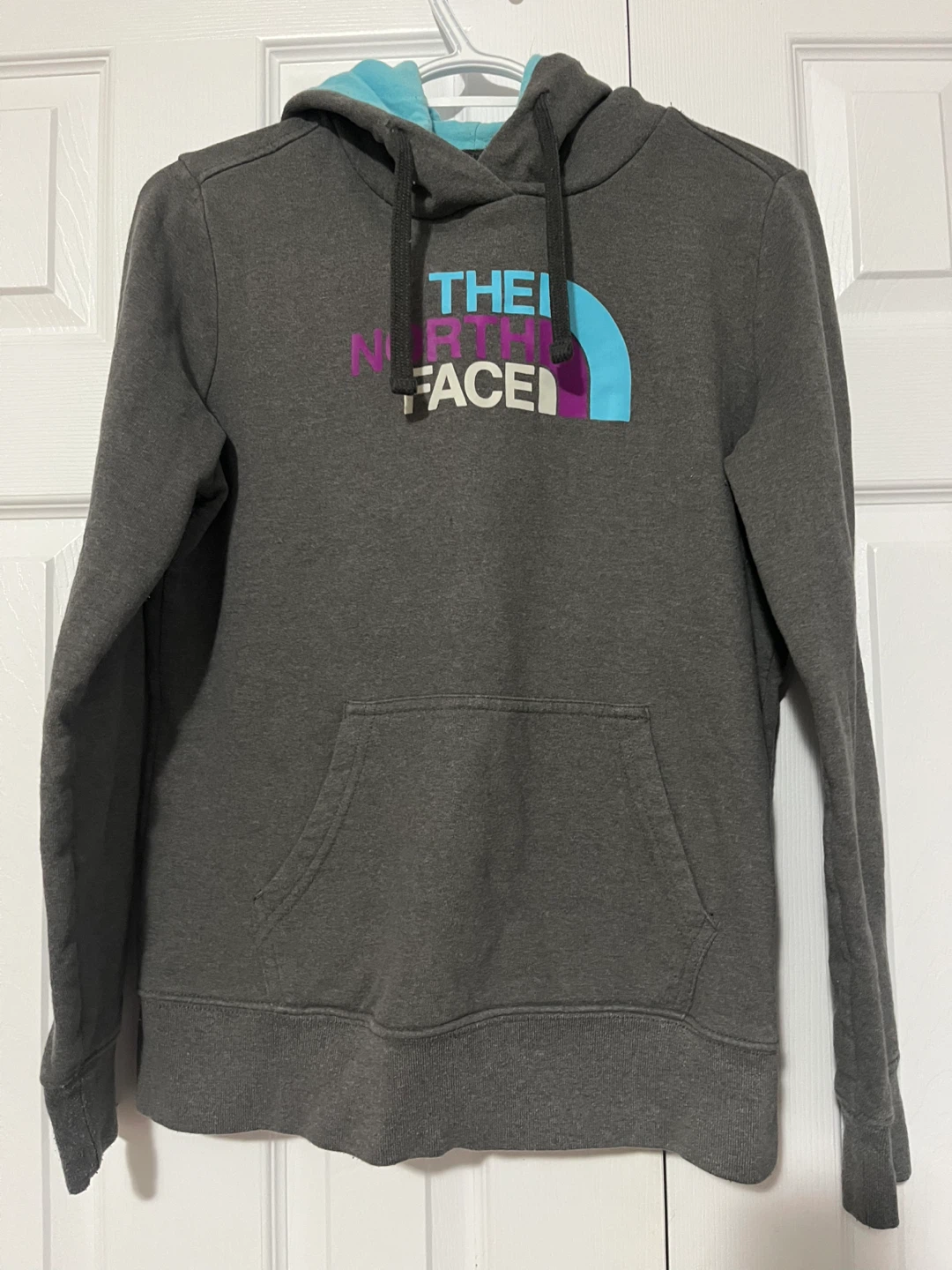Selling a comfy The North Face hoodie! It's grey with a colourful logo and a light blue lining in the hood. Perfect for keeping cozy on cooler days!