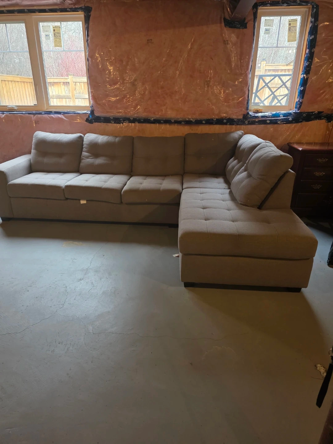 This is a comfortable sectional sofa. It's a light beige colour. The fabric is soft to the touch. It's a great addition to any living space!