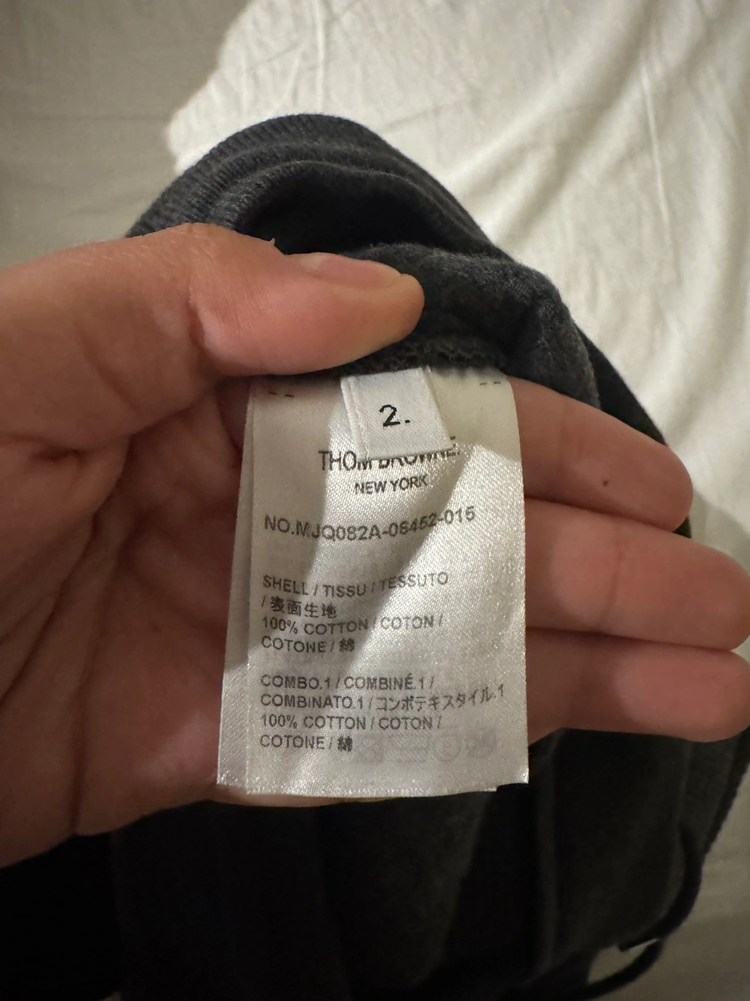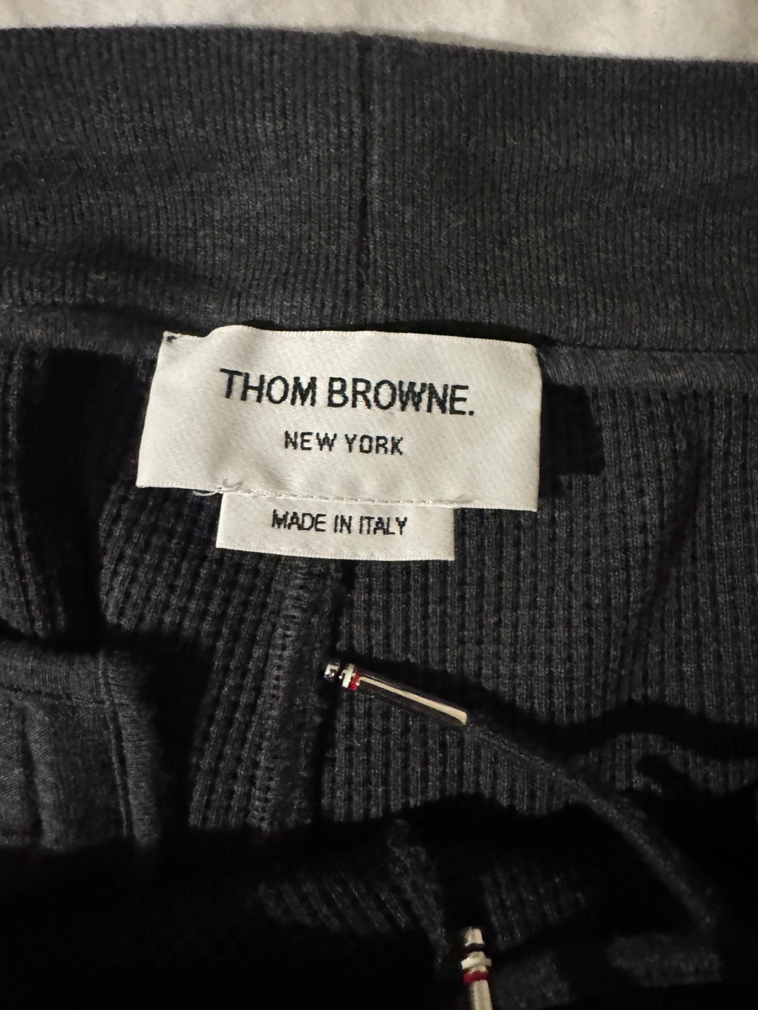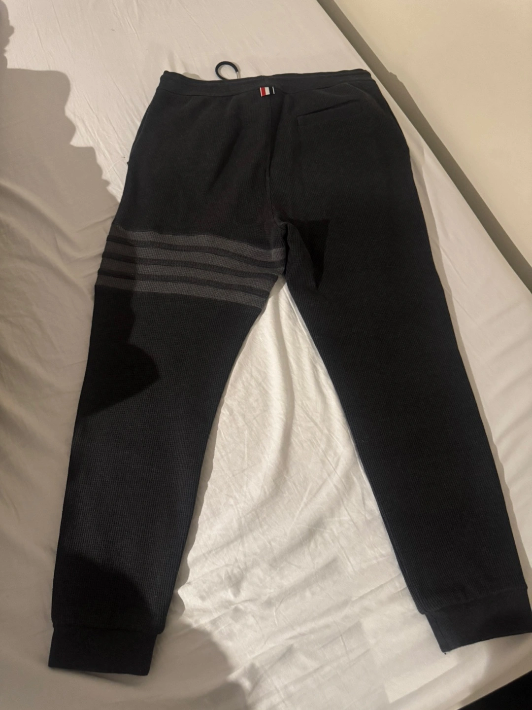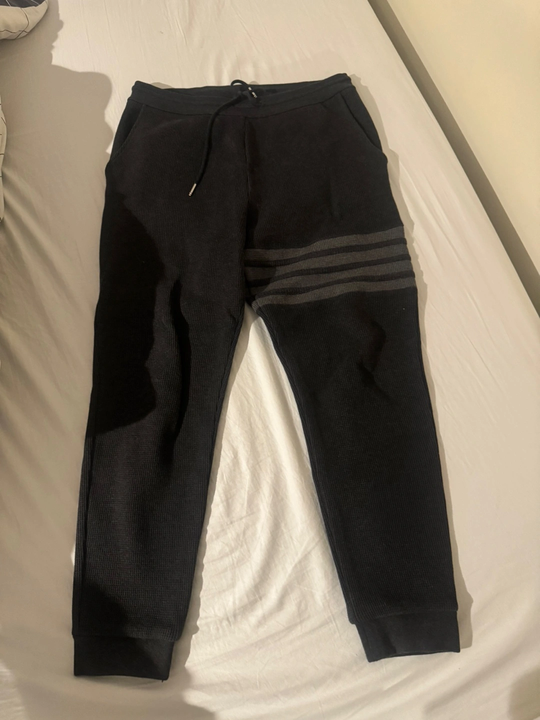 Here are some Thom Browne jogger pants in black! They are made in Italy and are 100% cotton. They feature the signature Thom Browne stripes on the leg Location: Oakville/toronto