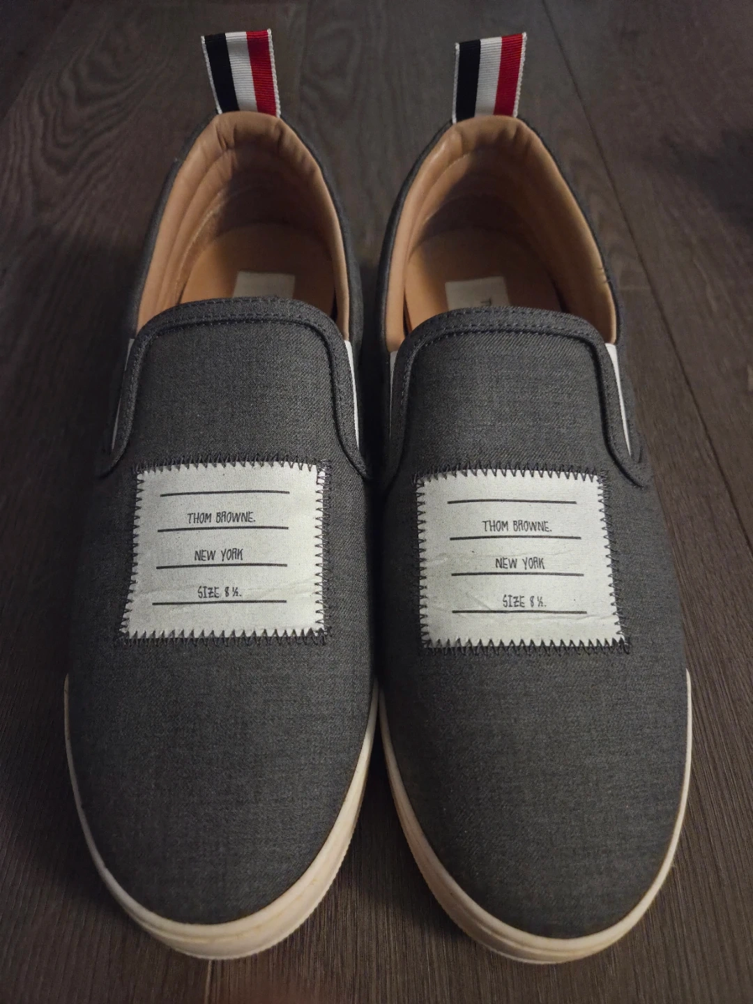 70Selling a pair of Thom Browne slip-on shoes in a stylish grey colour! They are in brand new never worn condition and ready for a new home. Size 8.5 have original receipt for serious buyers, original box and cloth wrap. They are selling online now for retail price of 880$.