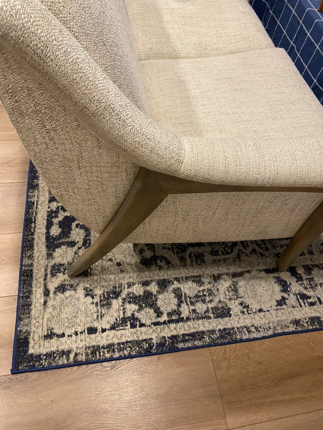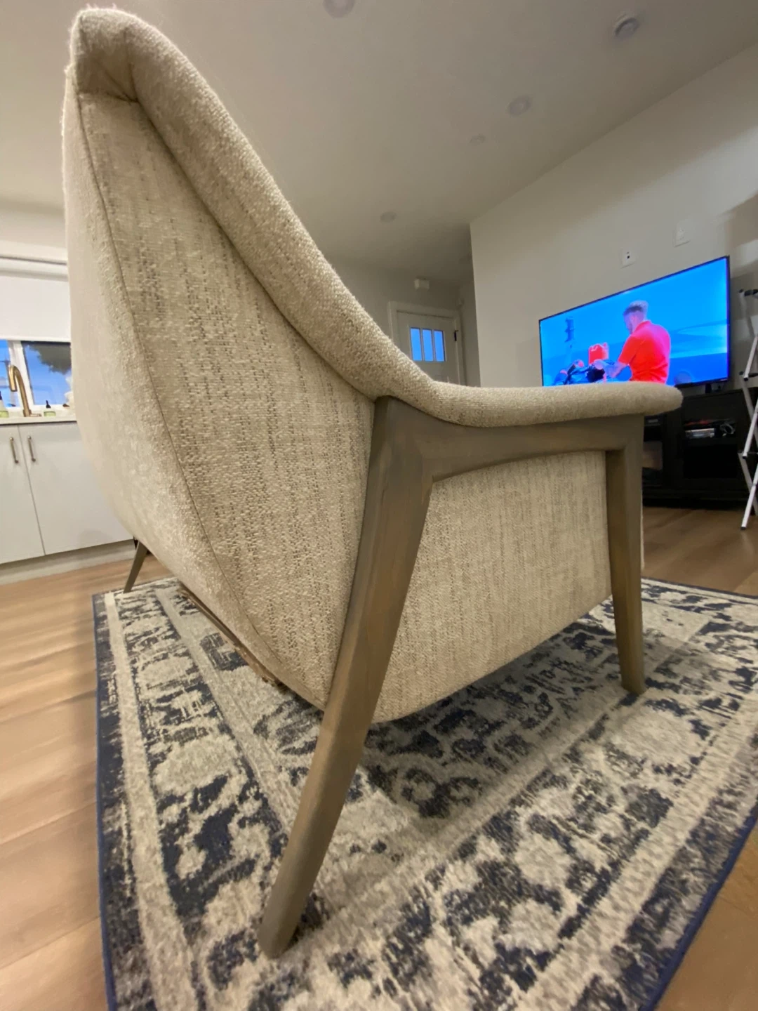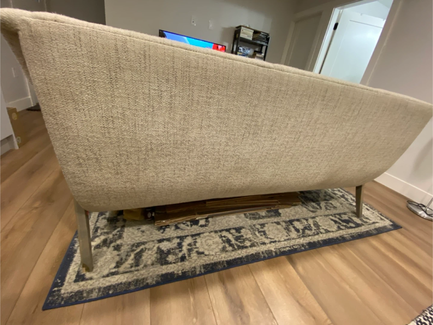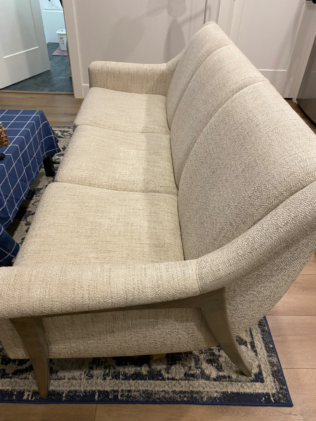 5Selling a beige sofa in good condition. It's a stylish and comfortable piece of furniture that would look great in any living room. The sofa has a neutral colour that will easily match with your existing decor. There is damage on the back left leg of the couch as pictured. This couch is suitable for small spaces.