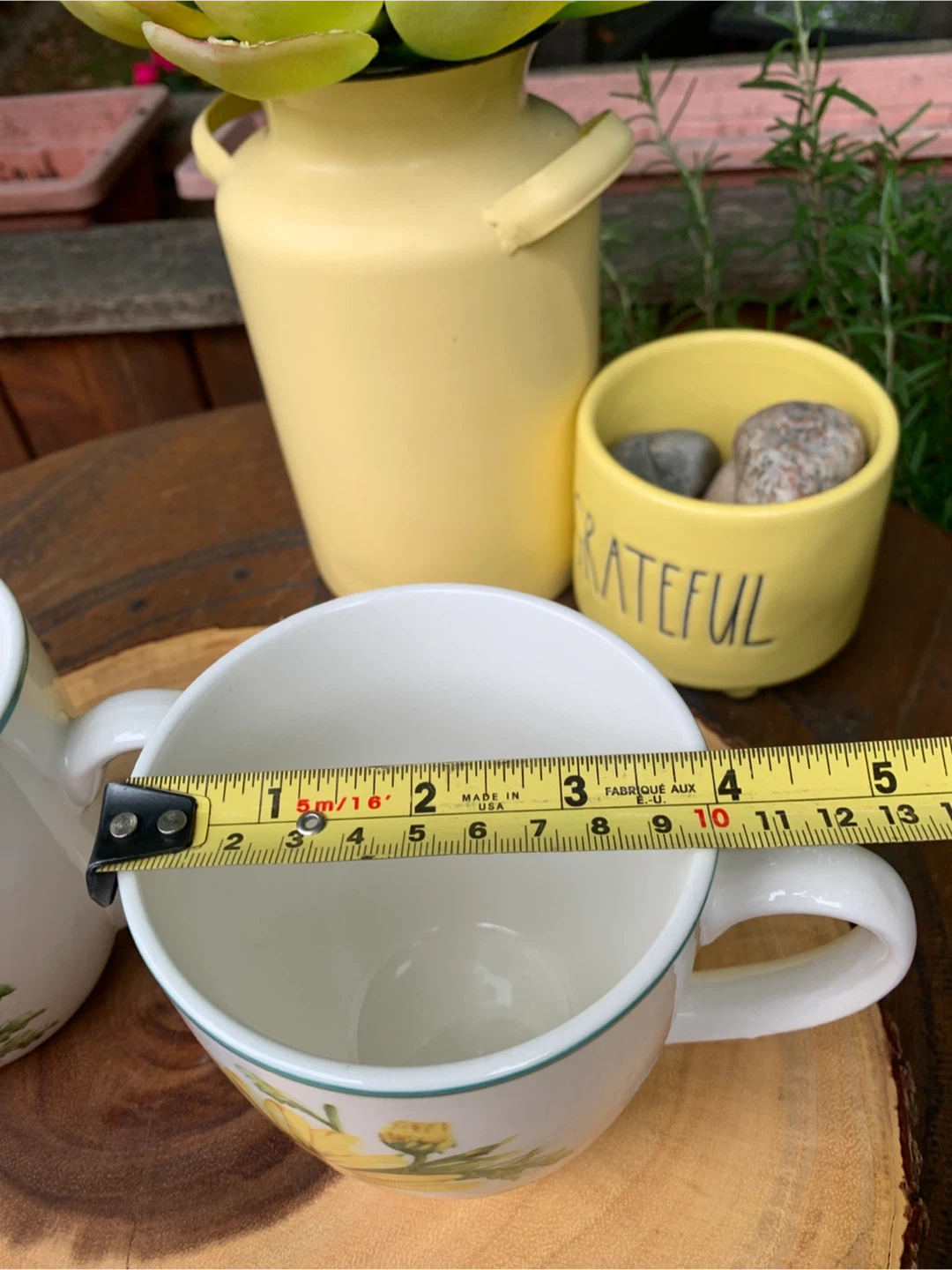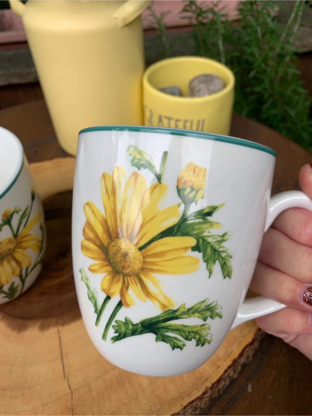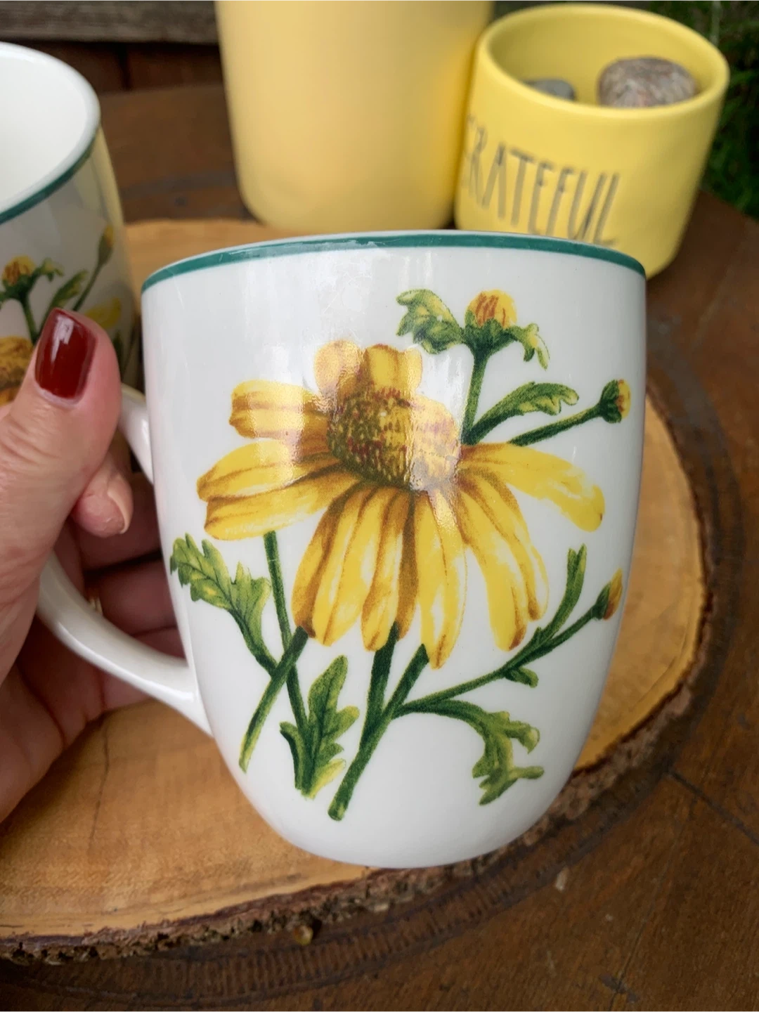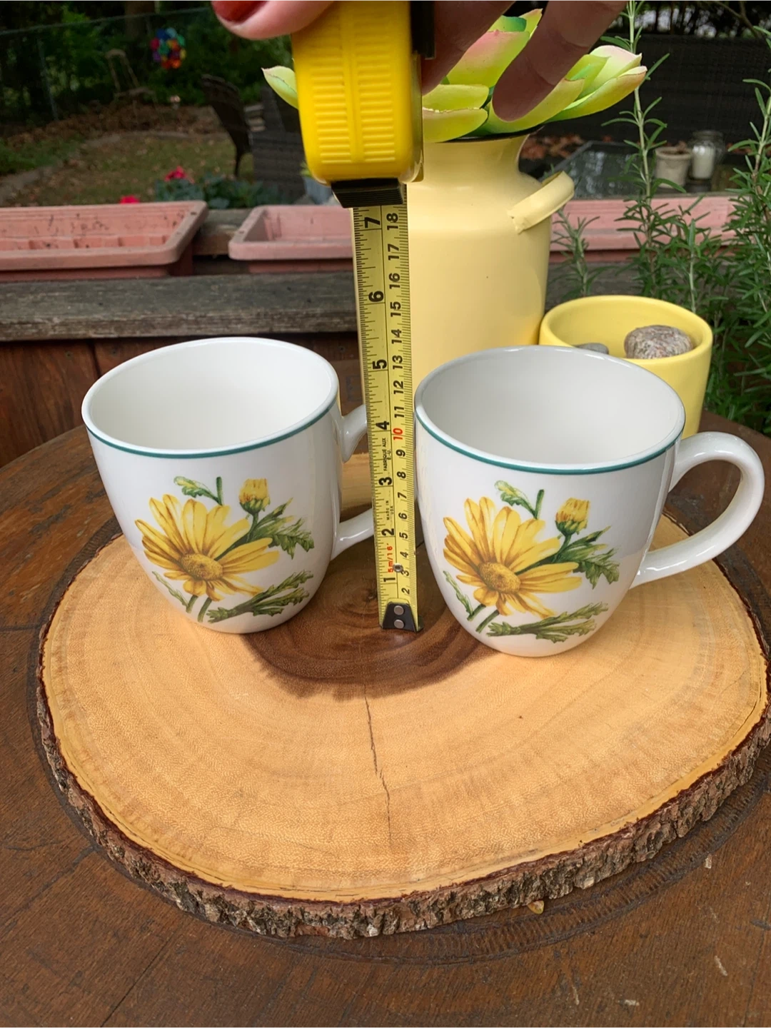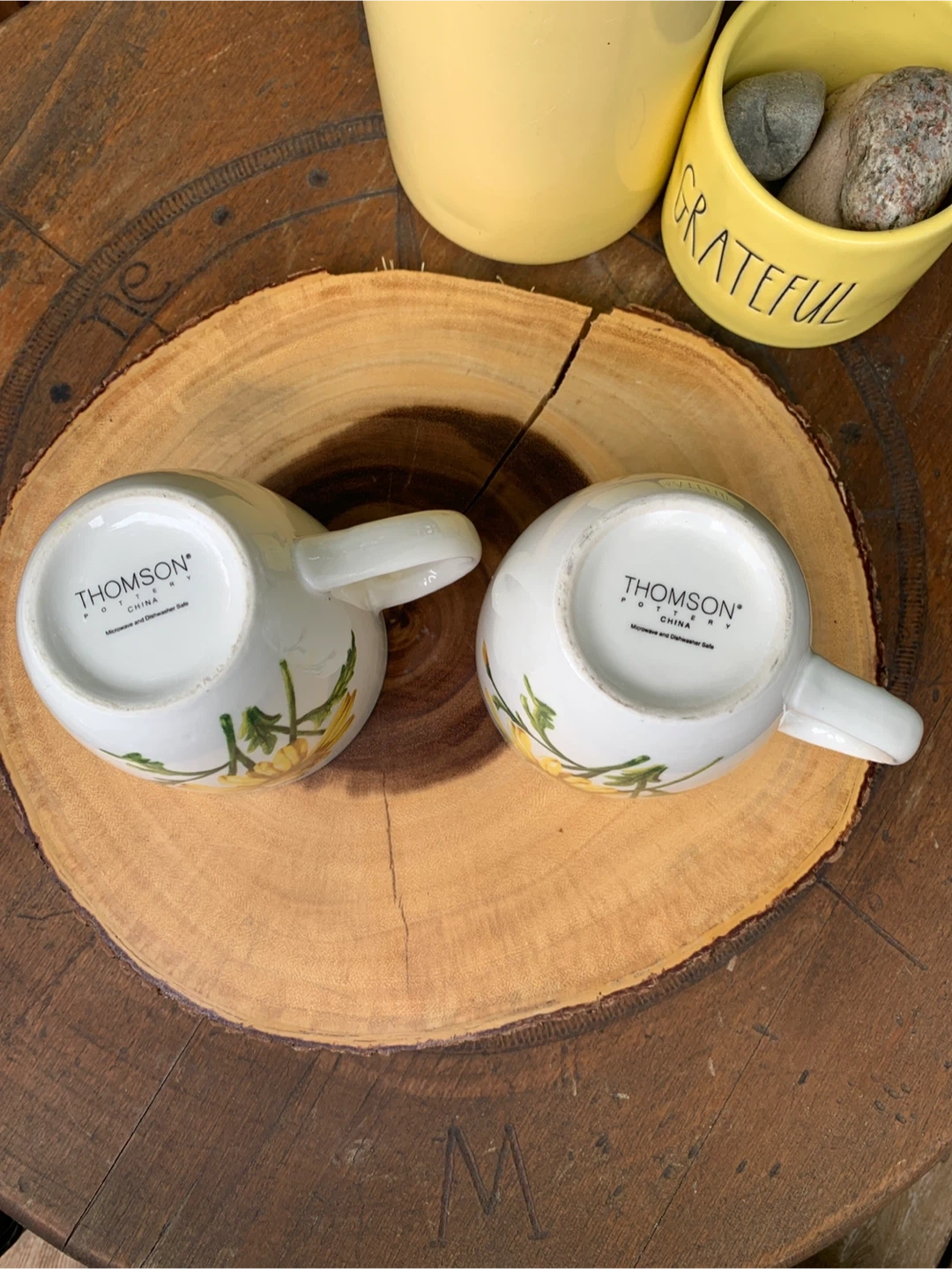Selling a set of two Thomson pottery mugs. They feature a lovely floral design with yellow flowers and green leaves. Sunflowers or daisies! They are 4” tall and wide so great for coffee, tea or hot cocoa! Microwave and dishwasher safe too. These mugs are in great shape and ready for a new home! Would look lovely styled on a kitchen counter or in your coffee bar area. Cash only please. Props not included.