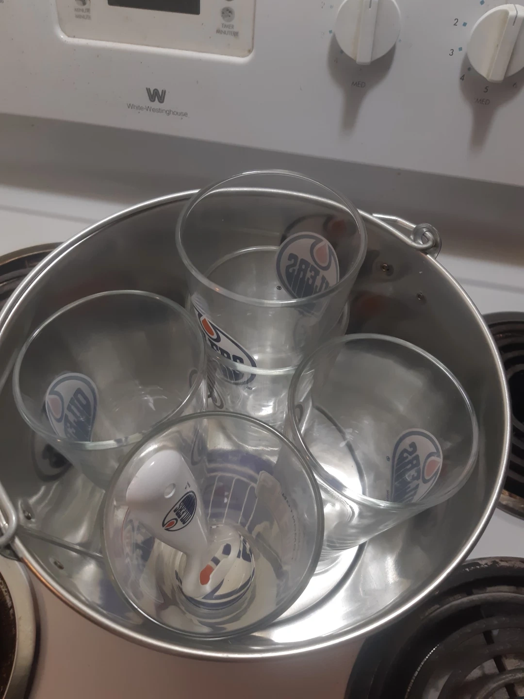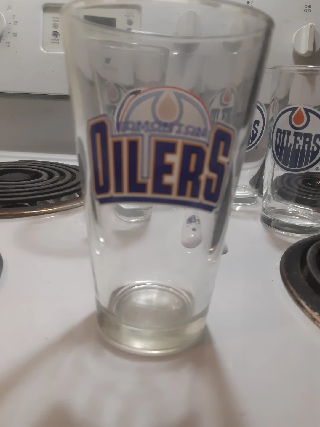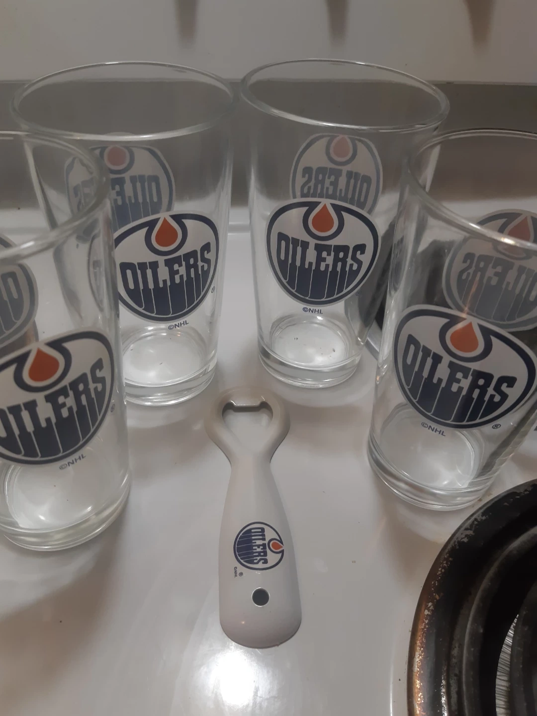 They come with a matching bottle opener, perfect for game nights or just enjoying a cold one. The glasses feature the classic Oilers logo. Great for any Oilers fan! It is brand new yet never use the package was just damaged so we took it off