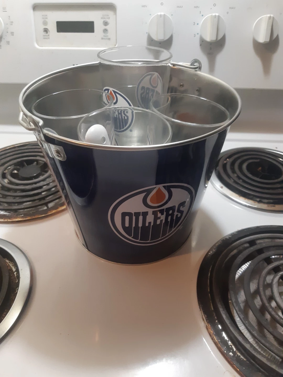 They come with a matching bottle opener, perfect for game nights or just enjoying a cold one. The glasses feature the classic Oilers logo. Great for any Oilers fan! It is brand new yet never use the package was just damaged so we took it off
