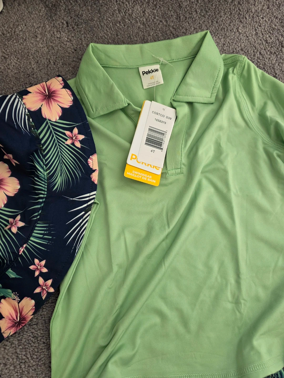 This is a Pekkle swimwear set with a light green polo shirt and navy blue floral patterned shorts. Both items are size 4T. The shirt has a collared neckline and short sleeves. It's perfect for a day at the beach or pool!