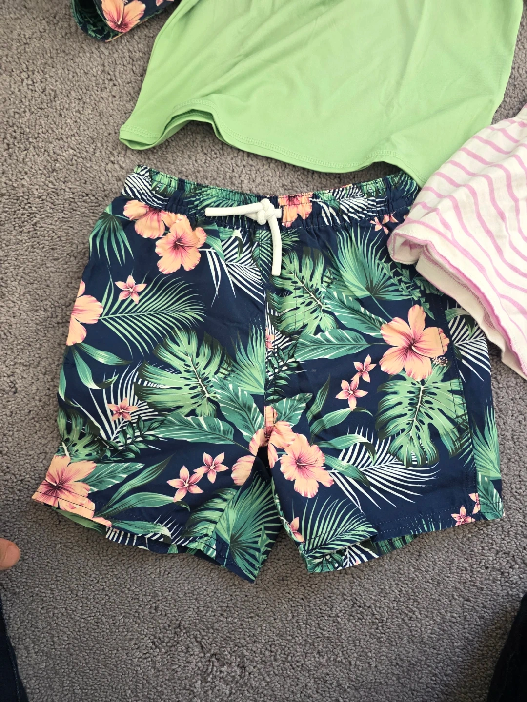 This is a Pekkle swimwear set with a light green polo shirt and navy blue floral patterned shorts. Both items are size 4T. The shirt has a collared neckline and short sleeves. It's perfect for a day at the beach or pool!