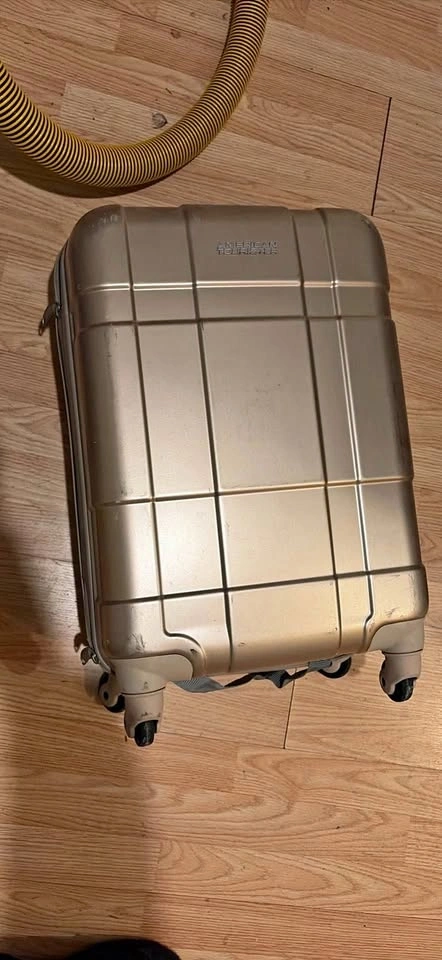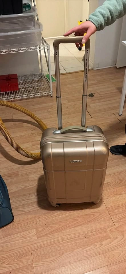 Stylish American Tourister gold carry-on suitcase. It has smooth spinner wheels and an extendable handle. Features a built-in TSA lock for security. Inside, you'll find mesh pockets and straps to keep your belongings organized. Great for your next trip!