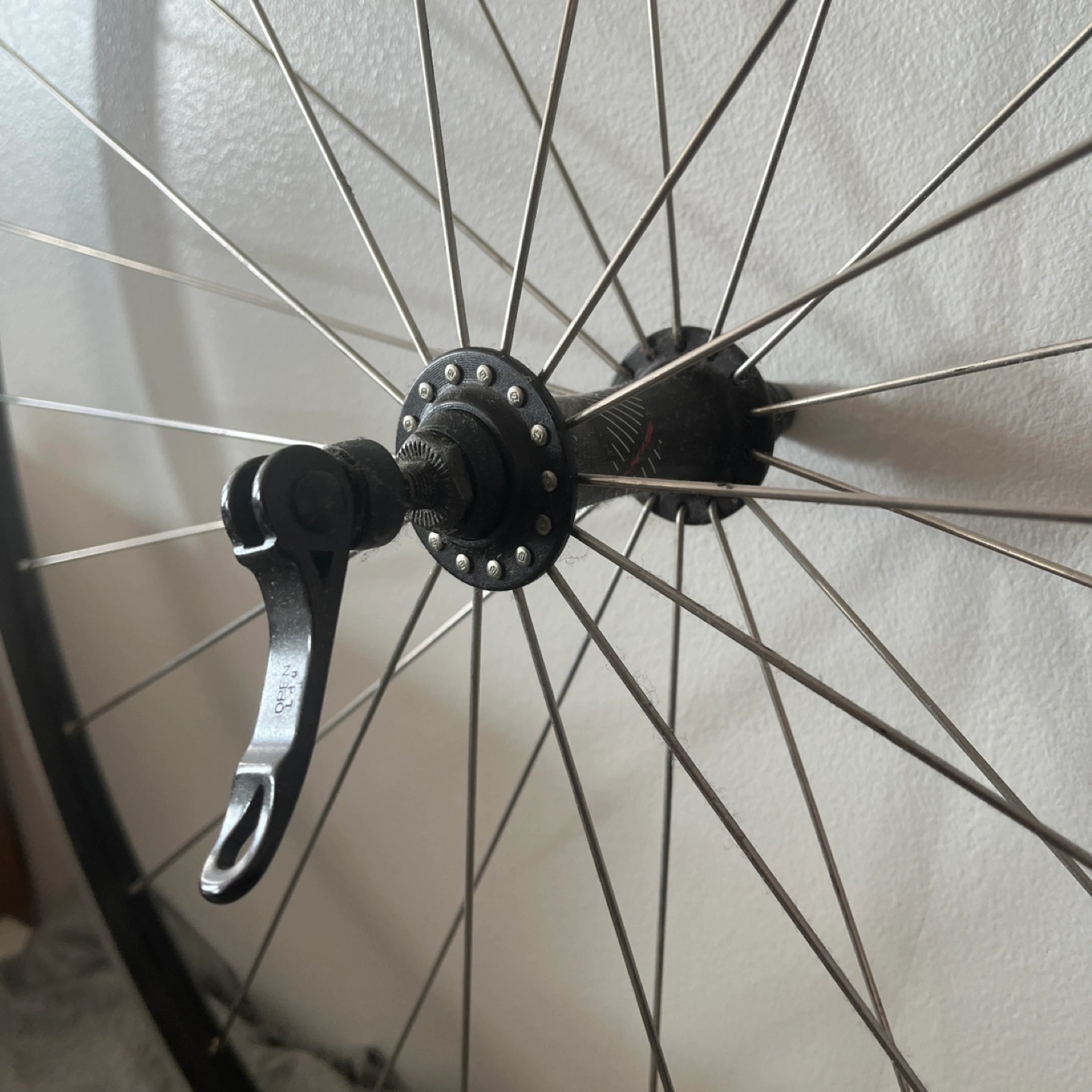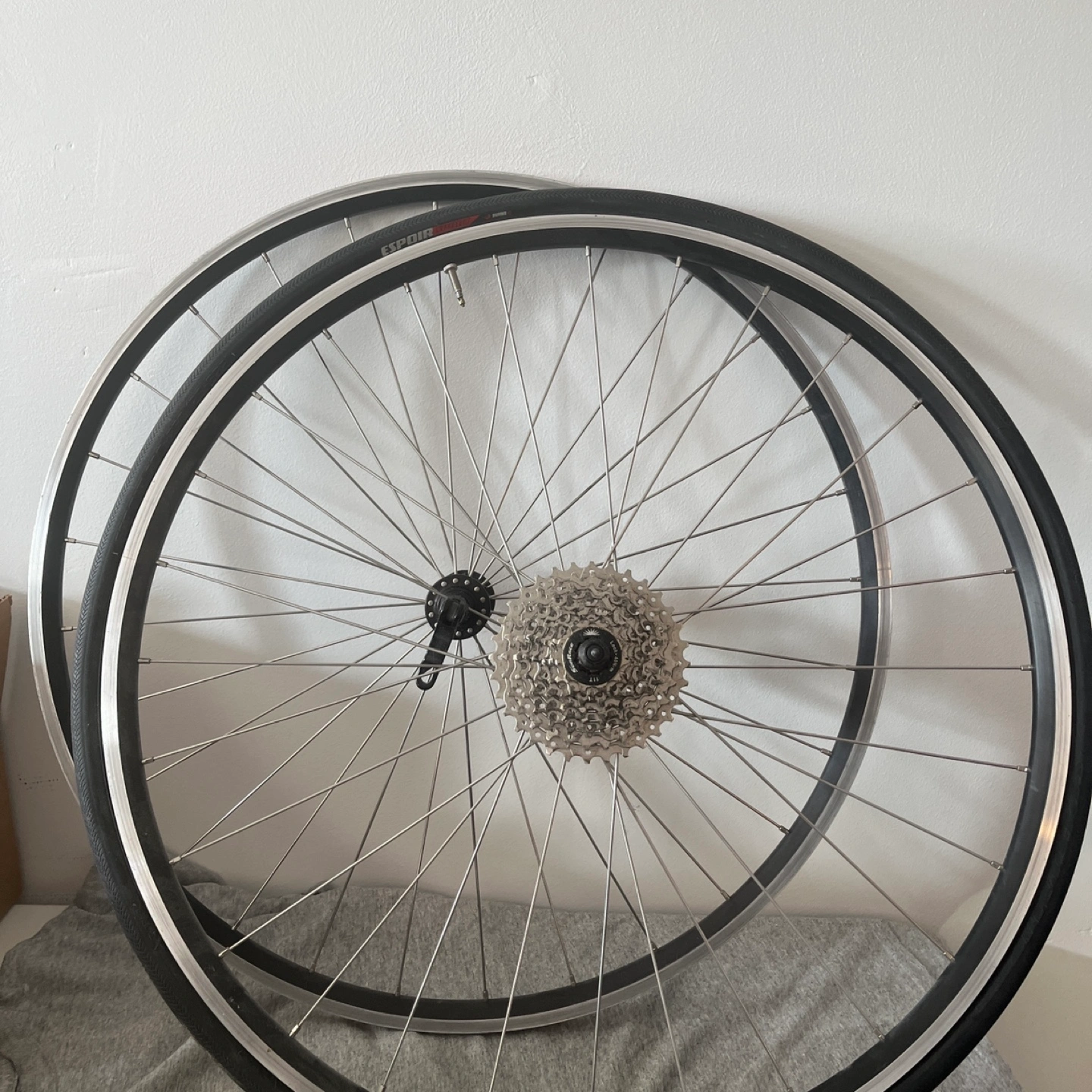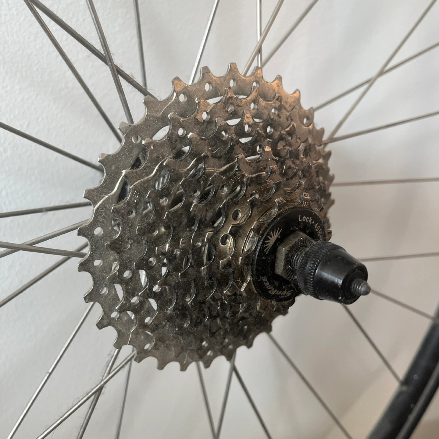 8 speed SunRace cassette and Axis hubs. Rims are in good condition, spins true and smooth.