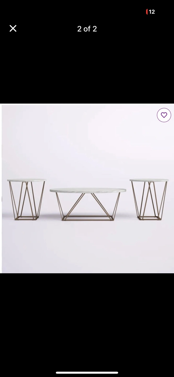 Brand new in box. Beautiful three-piece coffee table set. Features a large oval coffee table and two smaller round side tables. Marble tops and gold-tone metal legs. Modern and stylish design. Perfect for living room.