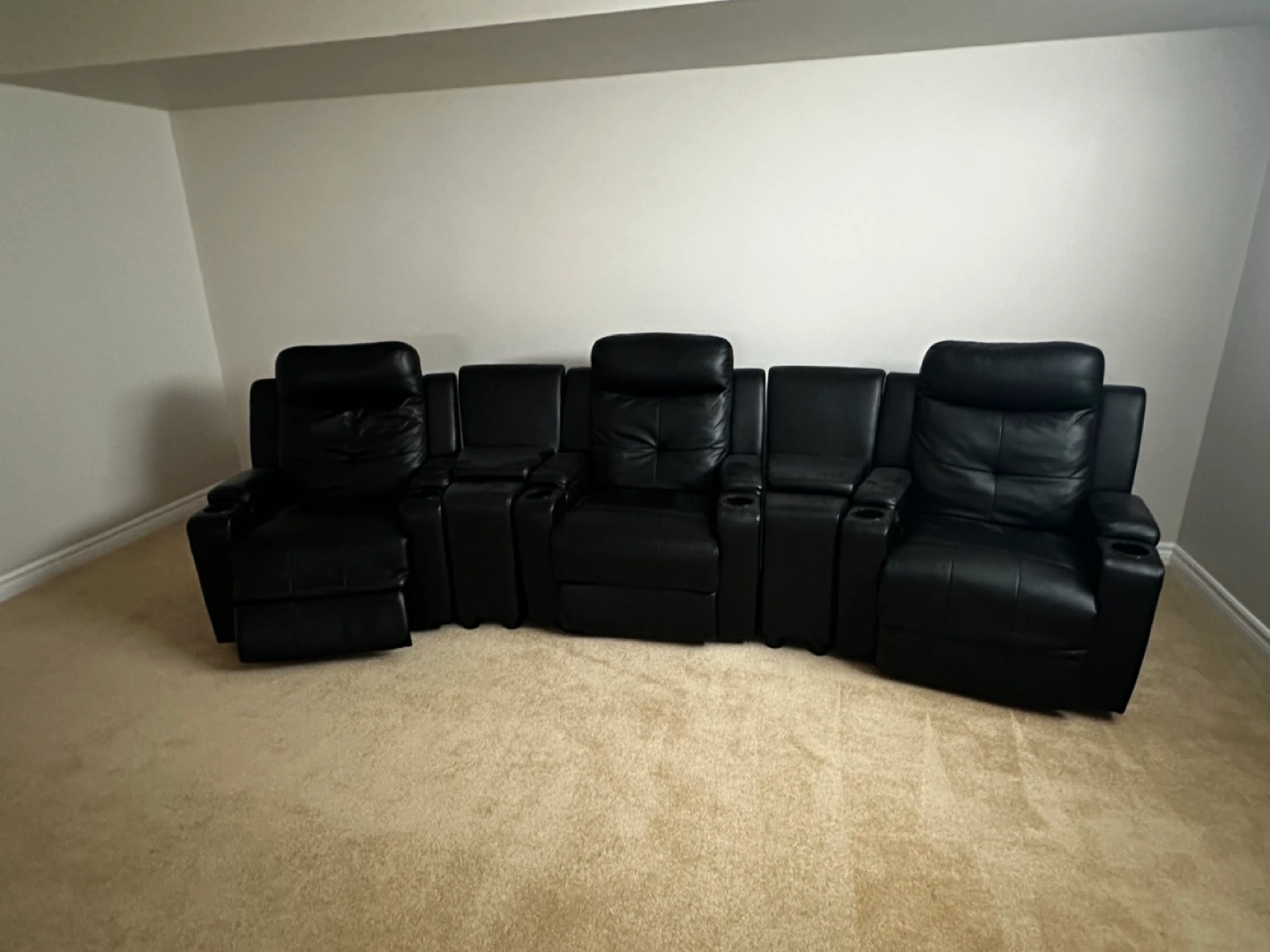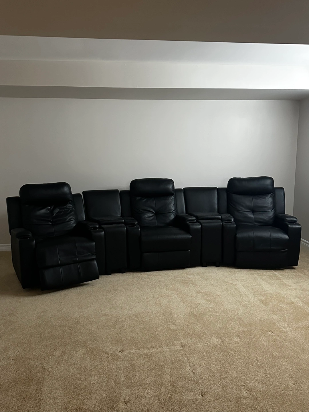 5Three-seat home theatre recliner set. Black leather. Reclining seats with cup holders. Excellent for a home theatre setup. Excellent condition. Moving sale, pick up in riverside south. Pickup only no delivery please. Bought new from Best Buy four years ago
