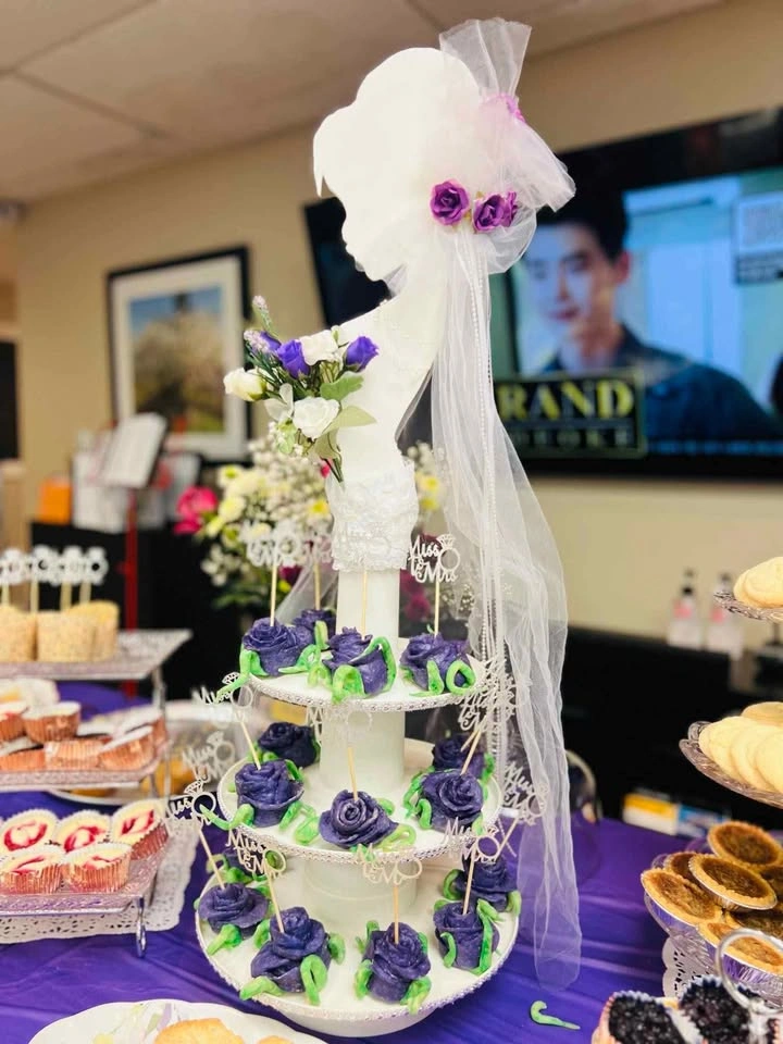 Three-tier cupcake bridal stand with flower and a veil to accentuate the figure of the bride. Used it for my bridal shower once and I am passing it to the next bride to be! It's in good condition and selling it for $15