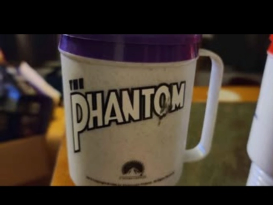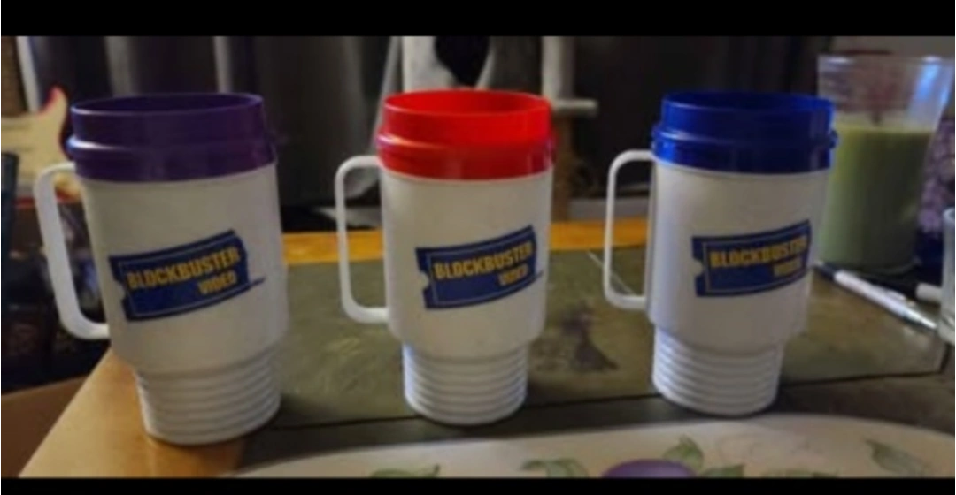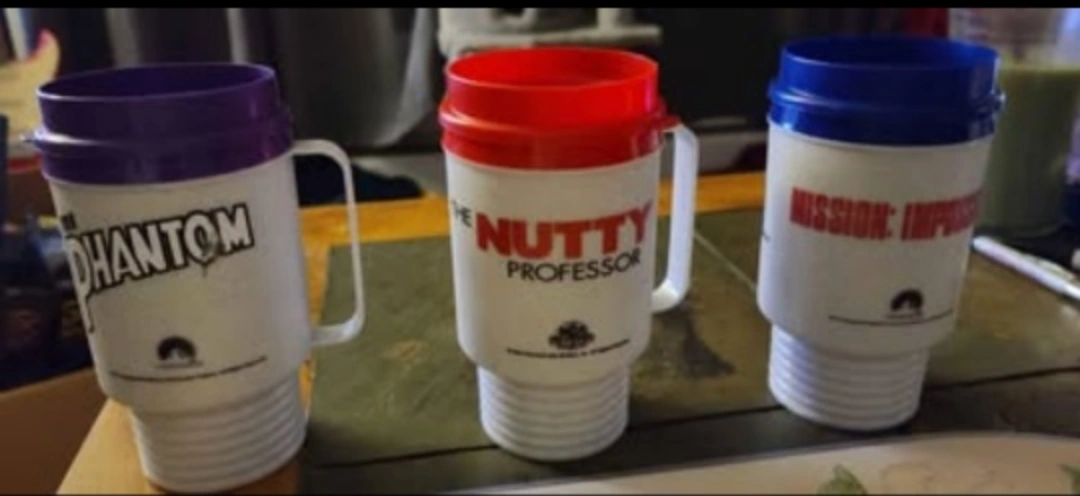 Set of three vintage Blockbuster Video promotional mugs. Each mug features a different movie title: The Phantom, The Nutty Professor, and Mission: Impossible. Plastic construction with coloured lids. The Phantoms ink is smudged... cash preferred, no holds, must pick up, no price negotiation at the door