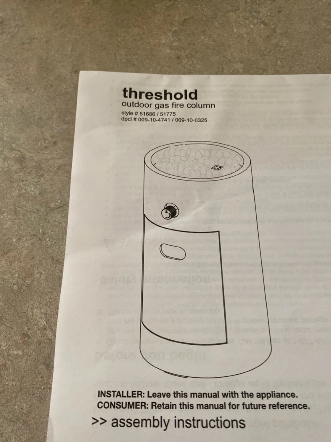 10Selling a Threshold outdoor gas fire column. It's in great shape and ready to add some ambiance to your outdoor space! The style number is 51686 or 51775. Comes with the original box and assembly instructions