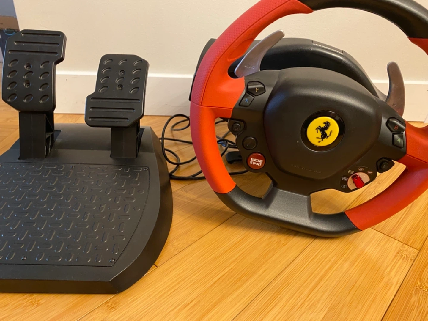 Selling a Thrustmaster Ferrari racing wheel complete with pedals! Perfect for racing games on Xbox console. It's in great shape and ready for a new home. Get ready to hit the virtual racetrack!