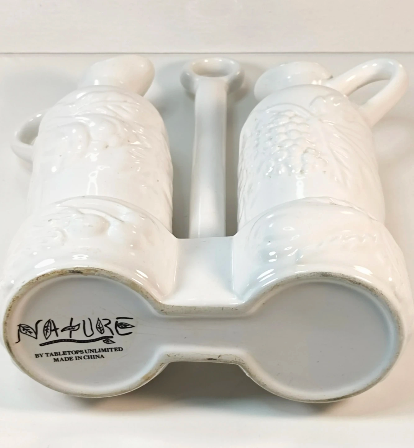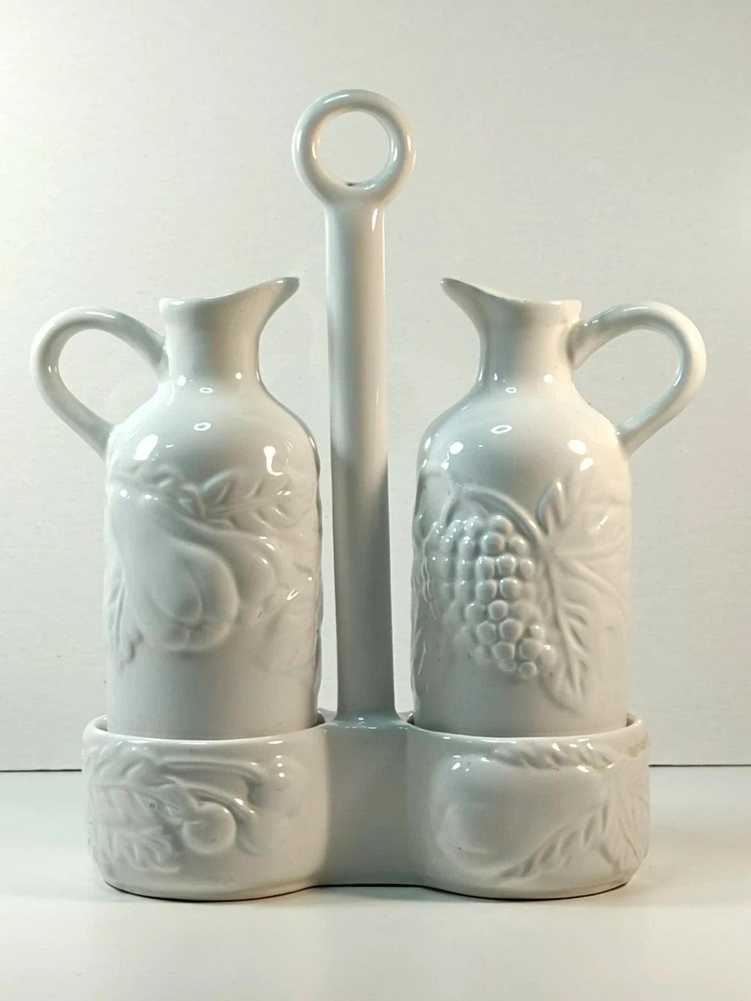 This white ceramic oil and vinegar cruet set features embossed fruit and grape designs. Made by Tabletops Unlimited, it comes with a convenient caddy for storage. It's perfect for your kitchen counter or dining table!