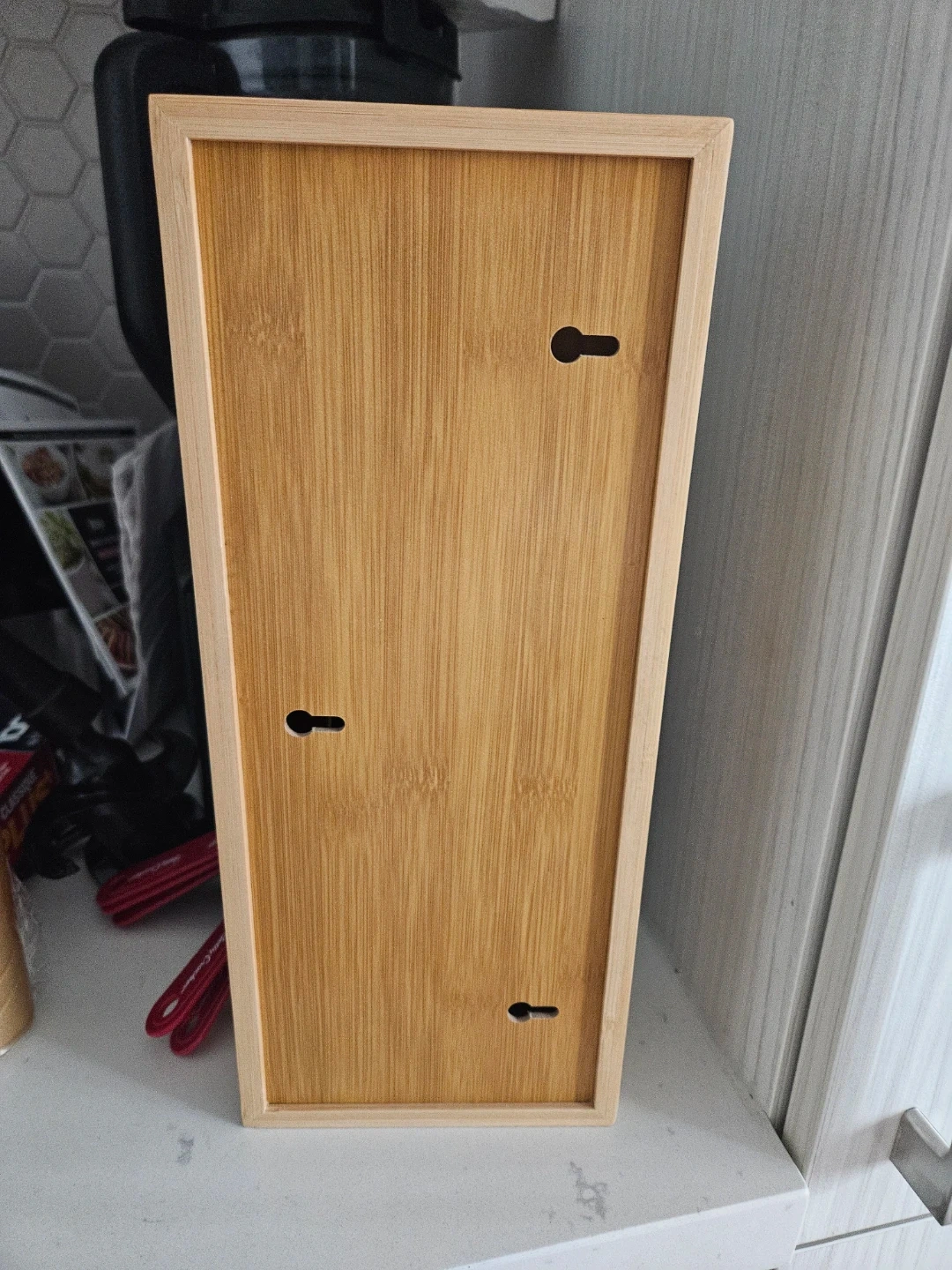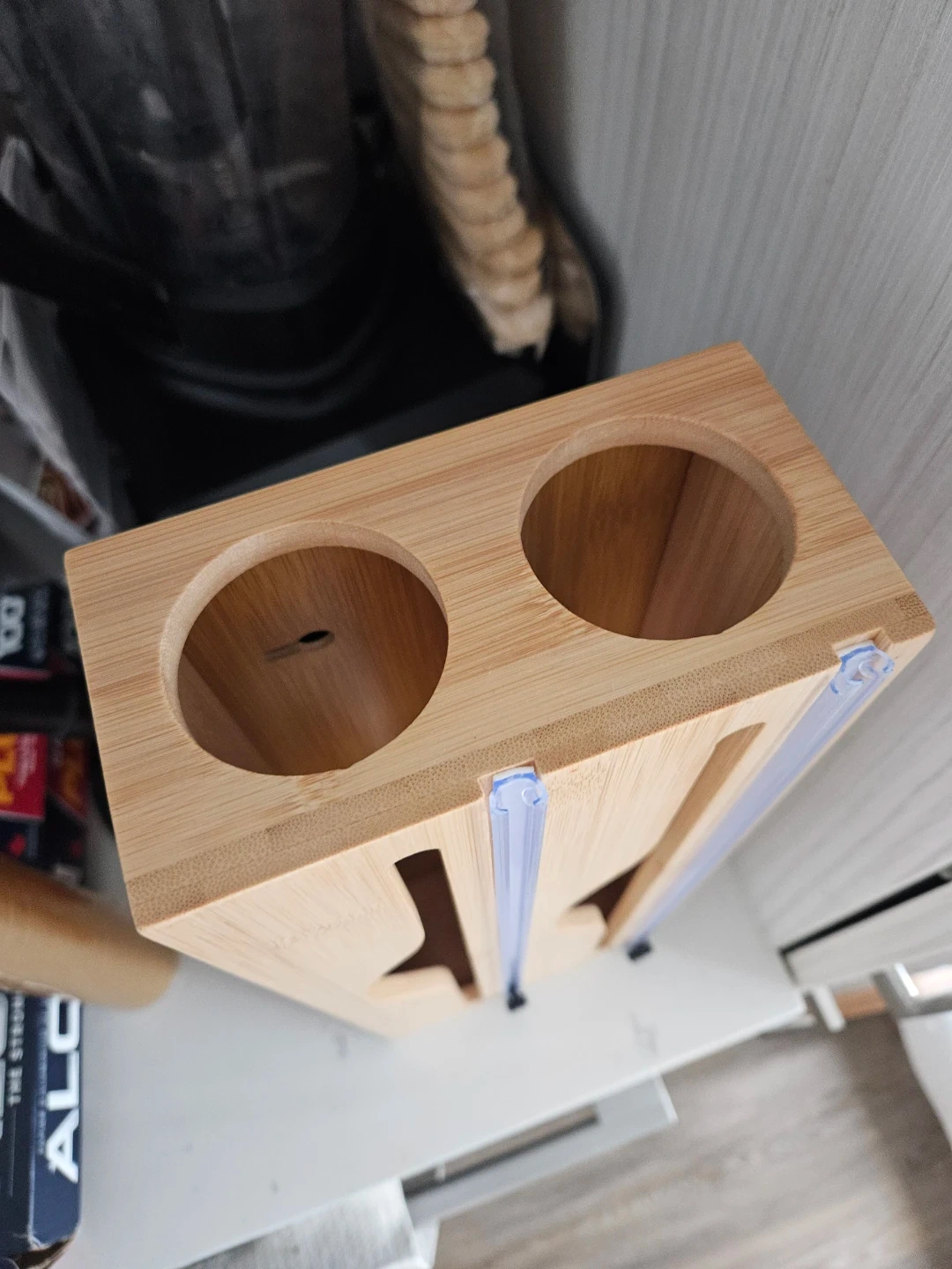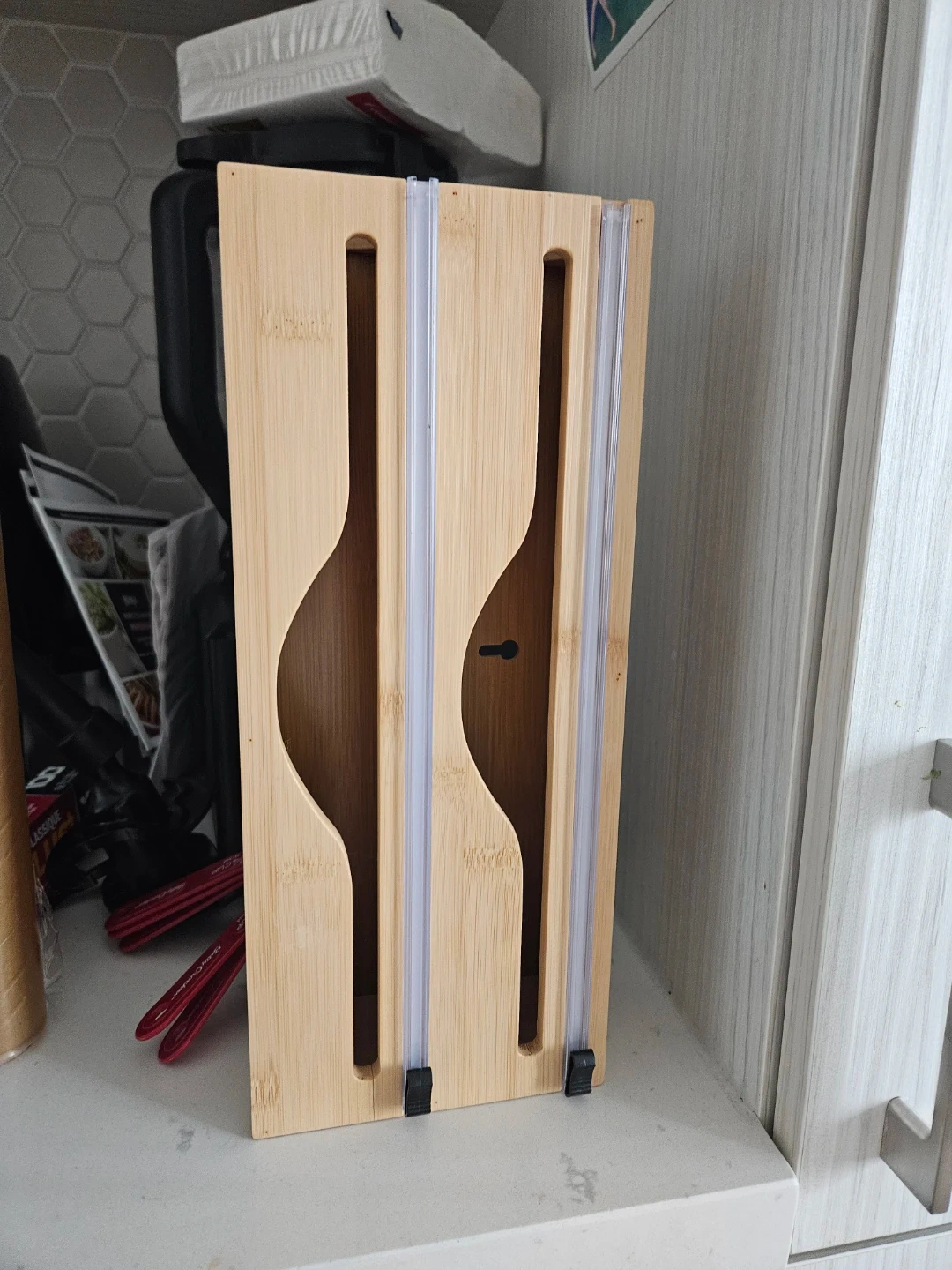 This bamboo organizer is designed to hold rolls of foil, plastic wrap, or parchment paper. It features two vertical slots for easy dispensing. Mounts to the wall or sits on a counter for convenient kitchen storage.