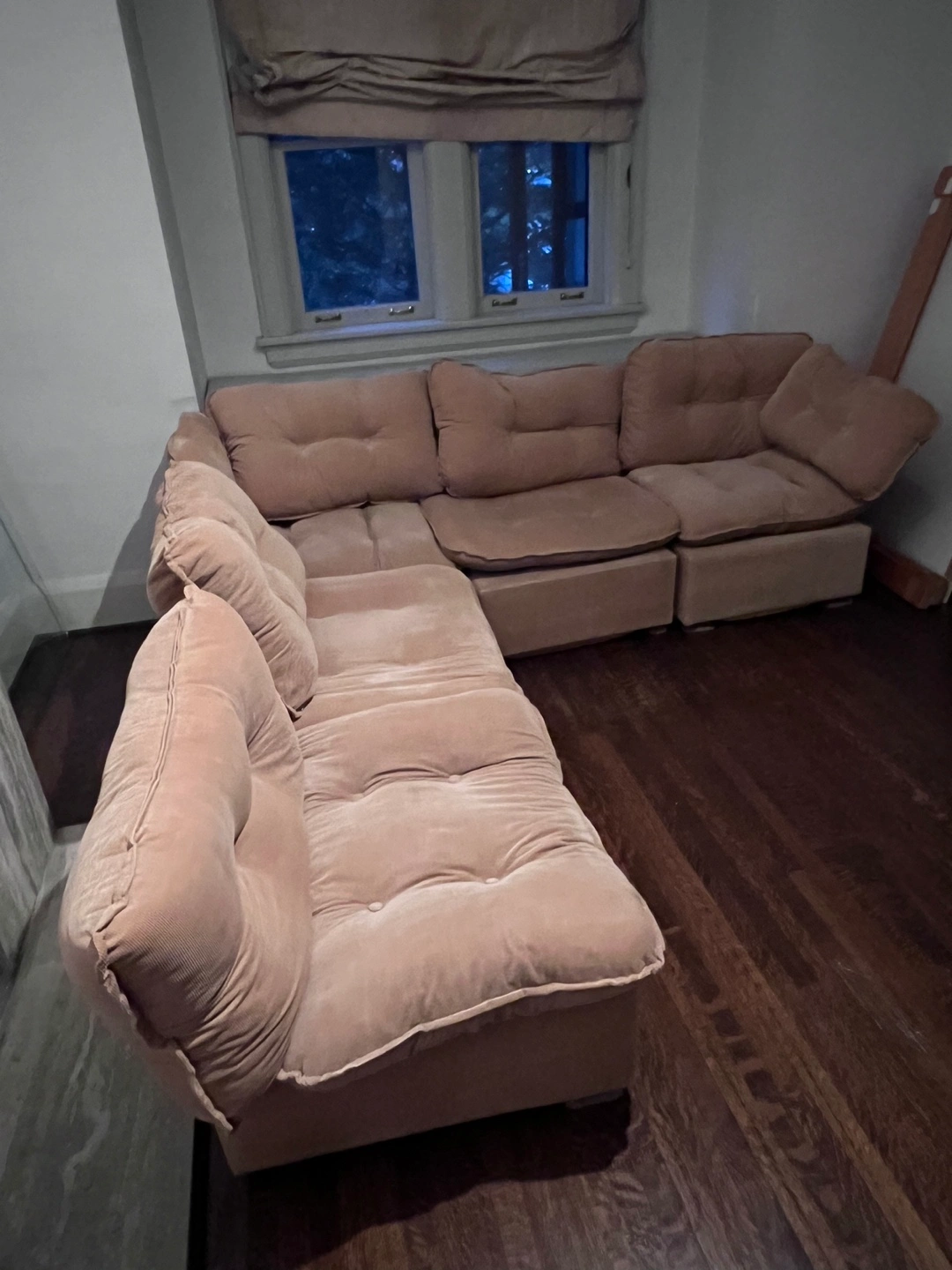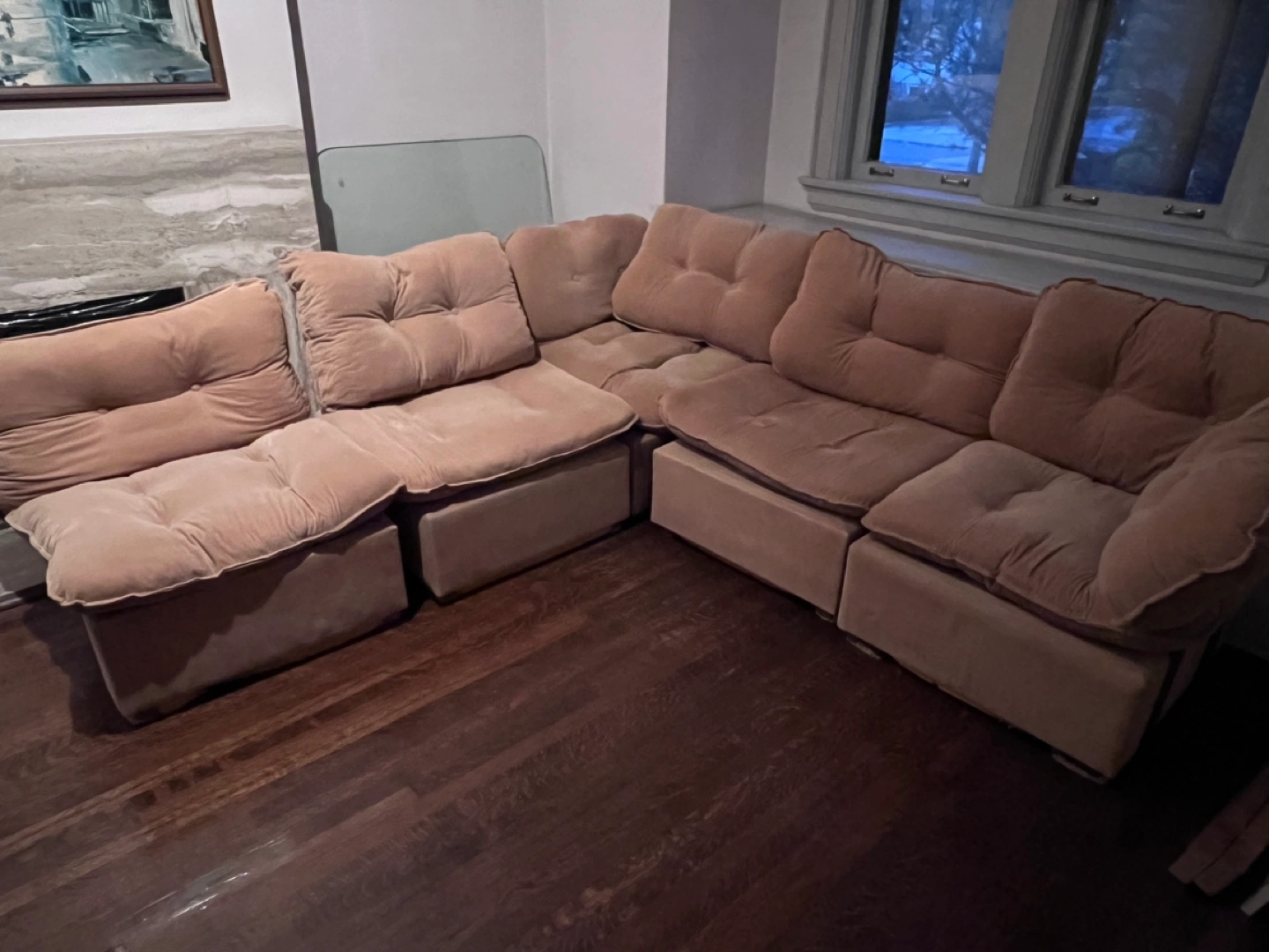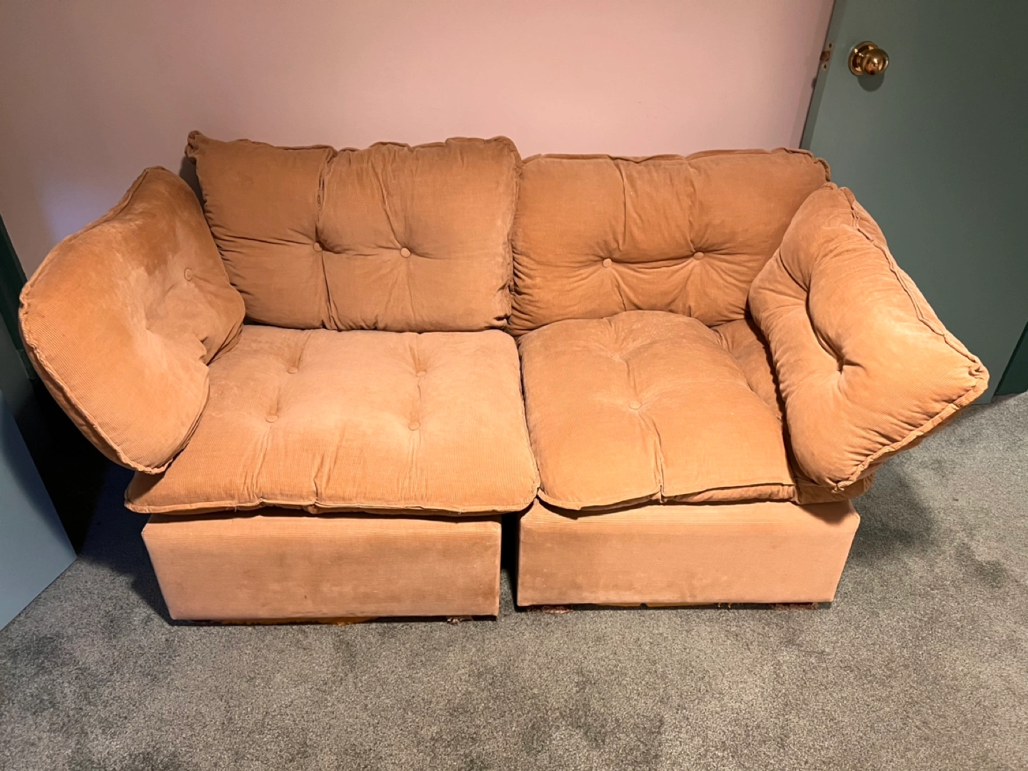 Tan vintage corduroy sectional, from a smoke and pet-free home! Cushions are a little soft but all detachable and can be replaced. 5 pieces in total, 2 end pieces and 3 middle.