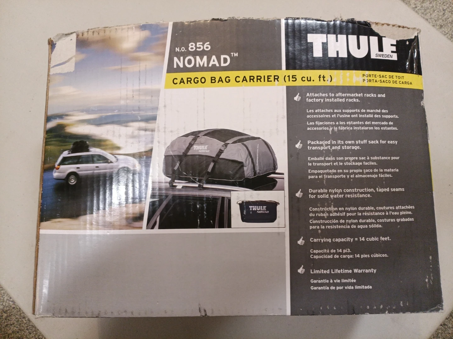 10Selling a Thule Nomad 856 cargo bag carrier! It has a carrying capacity of 14 cubic feet and attaches to aftermarket racks and factory installed racks. The durable nylon construction has taped seams for solid water resistance. It also comes packaged in its own stuff sack for easy transport and storage