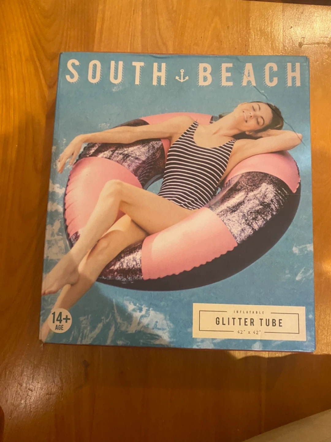 This is a new South Beach inflatable glitter tube, measuring 42" x 42". It's suitable for ages 14 and up. A fun addition for pool or beach days!
